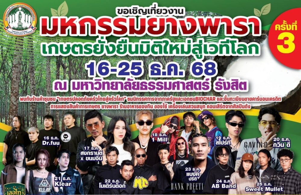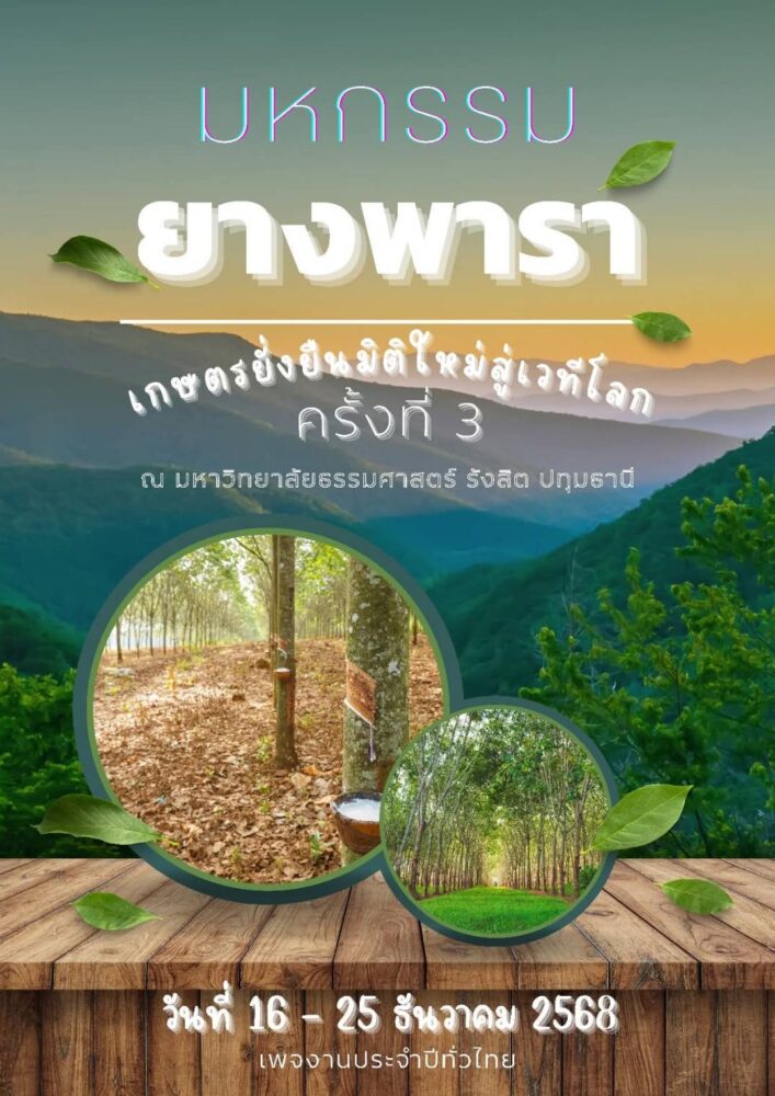 ดร.อุทัย สอนหลักทรัพย์ นายกสมาคมสหพันธ์ชาวสวนยางแห่งประเทศไทย กล่าวว่า งาน “มหกรรมยางพารา เกษตรยั่งยืน มิติใหม่สู่เวทีโลก” ครั้งที่ 3 ปีนี้สมาคมสหพันธ์ชาวสวนยางแห่งประเทศไทยเลือกจัด ณ ลานพญานาค มหาวิทยาลัยธรรมศาสตร์ ศูนย์รังสิตเปิดเผยระหว่างวันที่ 16-25 ธันวาคม 2568 รวมเวลา 10 วันถือเป็นงานยิ่งใหญ่กว่าปีที่ผ่านมา เพื่อเชิญชวนนักลงทุนชาวไทยและต่างประเทศให้มาลงทุนเพิ่มมากขึ้น และเป็นศูนย์กลางเชื่อมโยงประสานงานจําหน่ายยางและผลิตภัณฑ์ยางพาราสู่ผู้ใช้ได้โดยตรง โดยเฉพาะทำให้เกษตรกรได้รับความรู้ในการลดต้นทุน เพิ่มผลผลิต และมีรายได้ที่มั่นคง