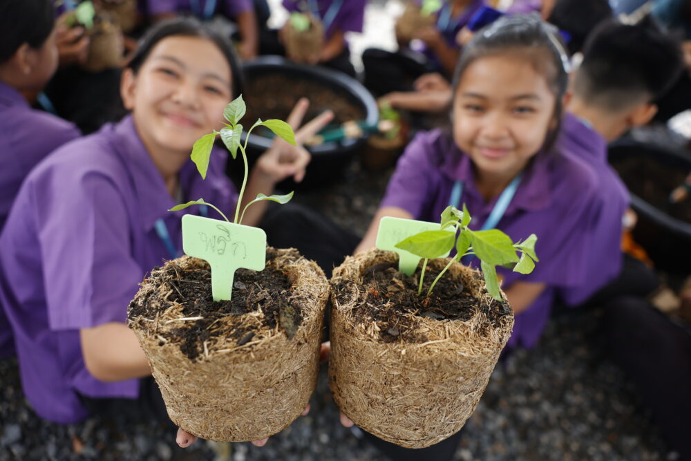 ต่อด้วยฐานที่ 2 “กระถางฟาง รักษ์โลก” ที่ทุกคนได้เรียนรู้ว่าฟางข้าวซึ่งเดิมที่มักถูกเผาทิ้งหรือไม่ได้ถูกนำมาใช้ประโยชน์ สามารถแปรรูปเป็นกระถางต้นไม้เป็นมิตรต่อสิ่งแวดล้อม ช่วยลดการปล่อยคาร์บอนฟุตพรินต์ และเป็นการคืนชีวิตใหม่ให้ทรัพยากรธรรมชาติ และปิดท้ายด้วยฐานที่ 3 “เพาะกล้า เติมยิ้ม” ที่น้องๆ นักเรียนและเจียไต๋อาสาร่วมกันเพาะกล้าจากเมล็ดพันธุ์คุณภาพจากเจียไต๋ อาทิ มะเขือเทศ กะเพรา โหระพา พริก และมะเขือ ก่อนนำลงปลูกในกระถางฟางข้าว เพื่อเรียนรู้การปลูกผักกินเองและนำความสุขกลับไปแบ่งปันที่บ้าน โดยทุกต้นกล้าที่ถูกเพาะในวันนี้ คือสัญลักษณ์ของการเริ่มต้นสิ่งดีๆ ที่กำลังเติบโตจากหัวใจของเจียไต๋อาสาทุกคน