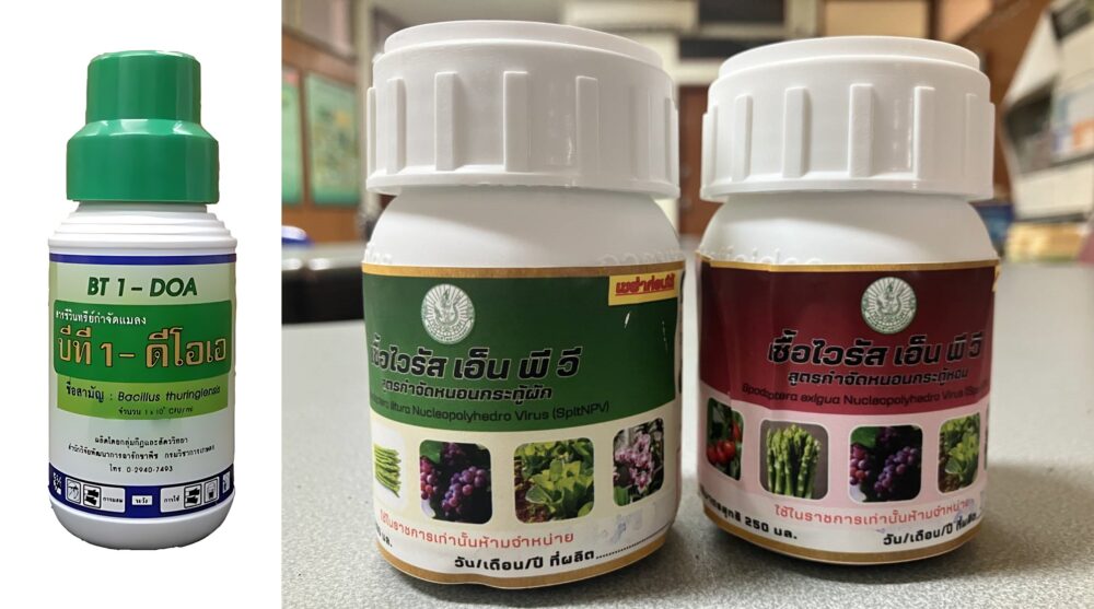 ถ้าโรคระบาดรุนแรง ให้ใช้เชื้อบีเอสอัตรา 20–40 มิลลิลิตรผสมน้ำ 20 ลิตร ฉีดพ่นติดต่อกัน 2 ครั้ง ห่างกัน 3-4 วัน หรือฉีดพ่นทุก 7 วันช่วงฟื้นฟู หรือใช้เชื้อบีเอสคลุกเมล็ดพันธุ์ก่อนเพาะปลูกใหม่, บาซิลลัสทูริงเจนซิส หรือบีที ช่วยควบคุมหนอนศัตรูพืช ที่มักระบาดหลังน้ำลดเนื่องจากสภาพแปลงเกษตรมีความชื้นสูงและพืชอ่อนแอ จึงควรพ่นทันทีเมื่อเริ่มพบหนอน โดยผสมเชื้อบีทีชนิดผง (WP): 30–50 กรัมต่อน้ำ 20 ลิตร หรือชนิดน้ำ (SC/SL): 20–40 ซีซีต่อน้ำ 20 ลิตร ฉีดพ่นเวลาเย็นทุก 5–7 วัน, เชื้อไวรัส NPV ช่วยควบคุมและกำจัดหนอนศัตรูพืชเฉพาะเจาะจงชนิด โดยเฉพาะกลุ่มหนอนกระทู้ต่าง ๆ เช่น หนอนกระทู้หอม หนอนกระทู้ผักหนอนเจาะสมอฝ้าย โดยใช้เชื้อไวรัส NPV อัตราส่วนประมาณ 20-30 มิลลิลิตร ต่อน้ำ 20 ลิตร ฉีดพ่นในเวลาเย็น