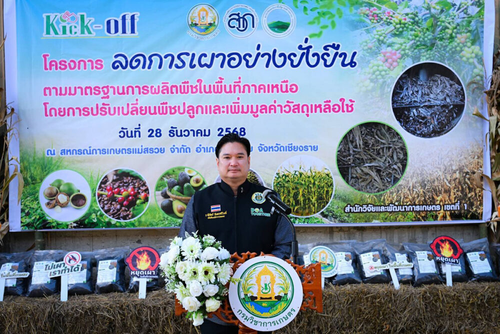 นายรพีภัทร์ จันทรศรีวงศ์ อธิบดีกรมวิชาการเกษตร เปิดเผยภายหลังเป็นประธานในพิธี เปิดงาน “Kick-off โครงการลดการเผาอย่างยั่งยื นตามมาตรฐานการผลิตพืชในพื้นที่ ภาคเหนือ โดยการปรับเปลี่ยนพืชปลูกและเพิ่ มมูลค่าวัสดุเหลือใช้ ทางการเกษตร” ณ สหกรณ์การเกษตรแม่สรวย จำกัด ตำบลท่าก๊อ อำเภอแม่สรวย จังหวัดเชียงราย ว่า การแก้ไขปัญหามลพิษฝุ่ นละอองขนาดเล็ก PM2.5 และการบริหารจัดการวัสดุเหลื อใช้ทางการเกษตร เป็นภารกิจสำคัญภายใต้นโยบายของ ร้อยเอกธรรมนัส พรหมเผ่า รองนายกรัฐมนตรี และรัฐมนตรีว่ าการกระทรวงเกษตรและสหกรณ์ ที่มุ่งเน้นการทำ “เกษตรที่โปร่งใส” ควบคู่กับนโยบาย “ตลาดนำ นวัตกรรมเสริม เพิ่มรายได้” เพื่อยกระดับสินค้าเกษตรไทยสู่ มาตรฐานสากลและเป็นมิตรต่อสิ่ งแวดล้อมในรูปแบบเกษตรคาร์บอนต่ำ