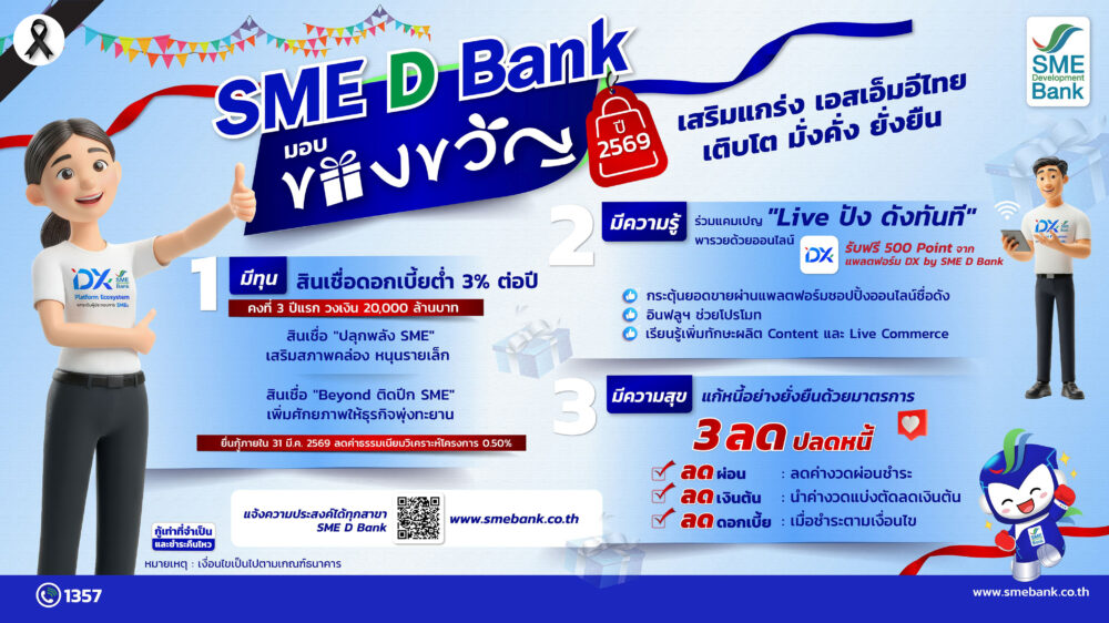 SME D Bank จัดชุดของขวัญปีใหม่ 2569 เพื่อเอสเอ็มอีไทย สร้างความสุข สนับสนุนธุรกิจเติบโตเข้มแข็งยั่ งยืน ได้แก่ 1. เติมทุนสินเชื่อดอกเบี้ยต่ำพิ เศษเพียง 3% ต่อปี คงที่ตลอด 3 ปีแรก วงเงินรวม 20,000 ล้านบาท แถมยื่นกู้ภายใน 31 มี.ค. 69 ลดค่าธรรมเนียมวิเคราะห์โครงการ 0.50% 2. เสริมทักษะ เพิ่มรายได้ด้วยตลาดออนไลน์ และ 3.ช่วยแก้หนี้ยั่งยืน คืนความสุข สร้างโอกาสพลิกฟื้นธุรกิจเดิ นหน้าได้ดีอีกครั้ง