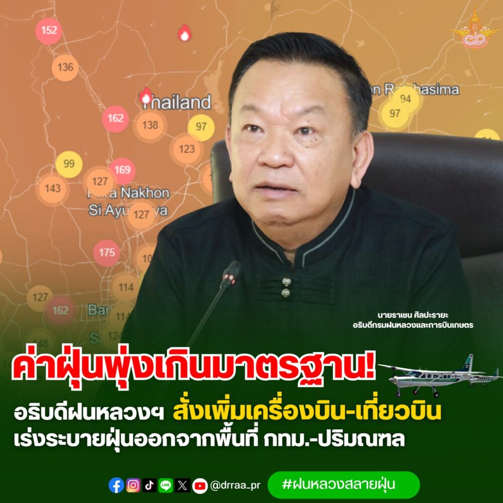 ปัจจุบันมีหน่วยฯ อ.หัวหิน จ.ประจวบคีรีขันธ์ ใช้เครื่องบินปฏิบัติการดัดแปรสภาพอากาศ จำนวน 4 ลำ ได้แก่ เครื่องบิน Super King Air 1 ลำ เครื่องบิน CARAVAN 3 ลำ หน่วยฯ จ.ระยอง สั่งการเพิ่มจำนวนเครื่องบินเป็น 3 ลำ ได้แก่ เครื่องบิน CN 1 ลำ เครื่องบิน CASA 2 ลำ และหน่วยฯ จ.ขอนแก่น ใช้เครื่องบิน CASA 3 ลำ เริ่มปฏิบัติการวันพรุ่งนี้ (15 ม.ค. 2569) เพื่อช่วยเหลือพื้นที่ทางภาคตะวันออกเฉียงเหนือที่ได้รับผลกระทบในขณะนี้ด้วย ในขณะที่ทางพื้นที่ภาคเหนือก็มีการติดตามสถานการณ์ฝุ่นละอองเป็นประจำ และเตรียมตั้งหน่วยดัดแปรสภาพอากาศ จ.ตาก และ จ.พิษณุโลก เริ่มปฏิบัติการวันที่ 1 กุมภาพันธ์ 2569 นี้