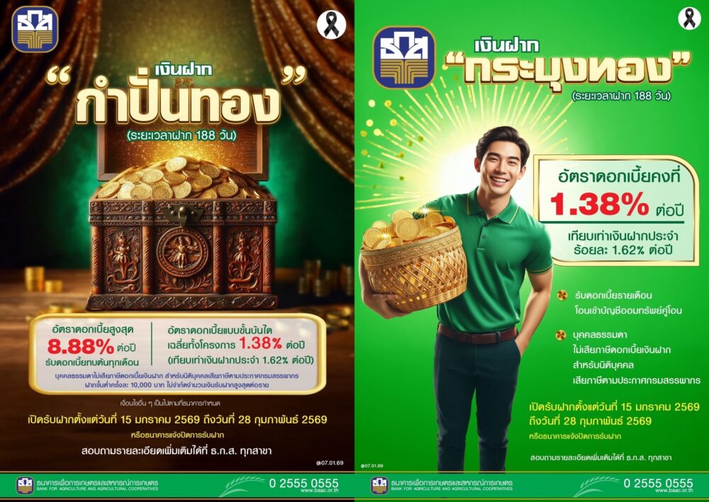 ธ.ก.ส. เปิดตัว 2 เงินฝากใหม่ สร้างทางเลือกการออมเงิน ได้แก่ “เงินฝากกำปั่นทอง” ที่ให้ดอกเบี้ยแบบขั้นบันไดสูงสุด ร้อยละ 8.88 ต่อปี ดอกเบี้ยทบต้นทุกเดือน เฉลี่ยทั้งโครงการร้อยละ 1.38 ต่อปี ระยะเวลาฝาก 188 วัน และ “เงินฝากกระบุงทอง” รับดอกเบี้ยรายเดือนทุกเดือน อัตราดอกเบี้ยคงที่ ร้อยละ 1.38 ต่อปี ระยะเวลาฝาก 188 วัน บุคคลธรรมดาไม่เสียภาษีดอกเบี้ยเงินฝาก เปิดรับฝากแล้วตั้งแต่วันที่ 15 มกราคม 2569 จนถึง 28 กุมภาพันธ์ 2569 หรือจนกว่าธนาคารแจ้งปิดการรับฝาก