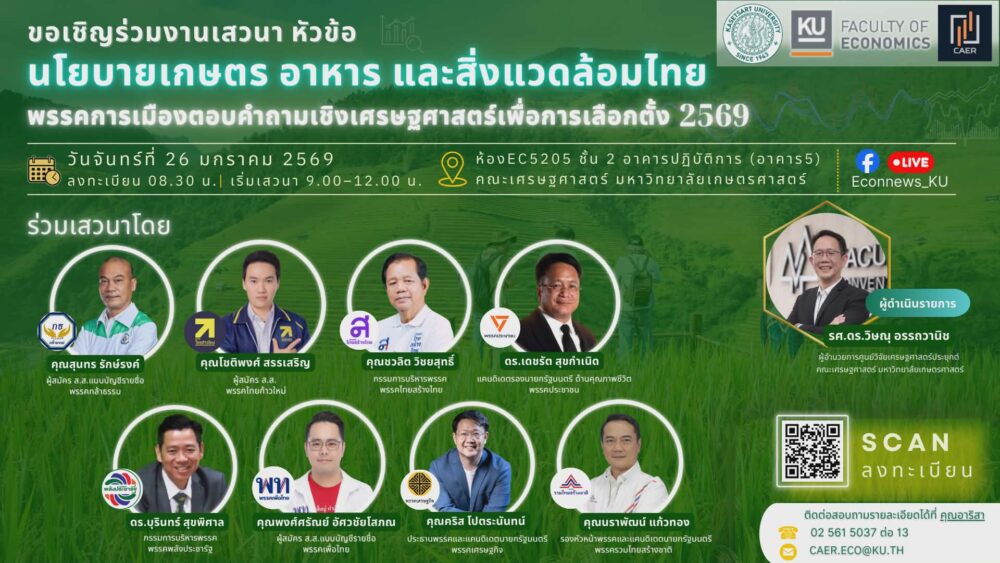 ศูนย์วิจัยเศรษฐศาสตร์ประยุกต์ คณะเศรษฐศาสตร์ มหาวิทยาลัยเกษตรศาสตร์ ขอเชิญนักวิชาการนิสิต นักศึกษา สื่อมวลชน และประชาชนผู้สนใจ เข้าร่วมงานเสวนาทางวิชาการ ในหัวข้อ “นโยบายเกษตร อาหาร และสิ่งแวดล้อมไทย: พรรคการเมืองตอบคำถามเชิงเศรษฐศาสตร์เพื่อการเลือกตั้ง 2569” ในวันจันทร์ ที่ 26 มกราคม 2569 เวลา 09.00–12.00 น. (ลงทะเบียนเวลา 08.30 น.) ณ ห้อง EC 5205 ชั้น 2 อาคารปฏิบัติการ คณะเศรษฐศาสตร์ มหาวิทยาลัยเกษตรศาสตร์ และรับชมการถ่ายทอดสดผ่าน Facebook Live : Economics Kasetsart