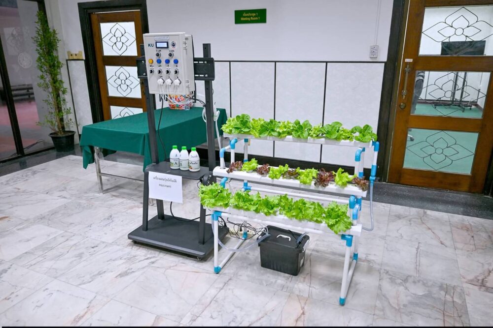 เครื่องผสมปุ๋ยอัตโนมัติ (กลุ่ม 2 นวัตกรรมการเกษตรยุคใหม่) เหมาะกับการปลูกพืชไร้ดินทั้งฟาร์มขนาดเล็กและฟาร์มขนาดใหญ่ ที่ต้องมีการปรับธาตุอาหารตามที่ต้องการทุกวัน เครื่องมือนี้ช่วยให้การผสมปุ๋ยมีประสิทธิภาพจากการผสมปุ๋ยอย่างถูกต้องตามค่าที่ต้องการผ่านการอ่านค่าจากเซนเซอร์วัดค่า EC และ pH โดยตรง ช่วยลดแรงงานคน ทำให้เกษตรกรบริหารจัดการฟาร์มได้อย่างแม่นยำมีประสิทธิภาพมากยิ่งขึ้น ทำงานได้ทั้งแบบกำหนดเองและแบบอัตโนมัติ