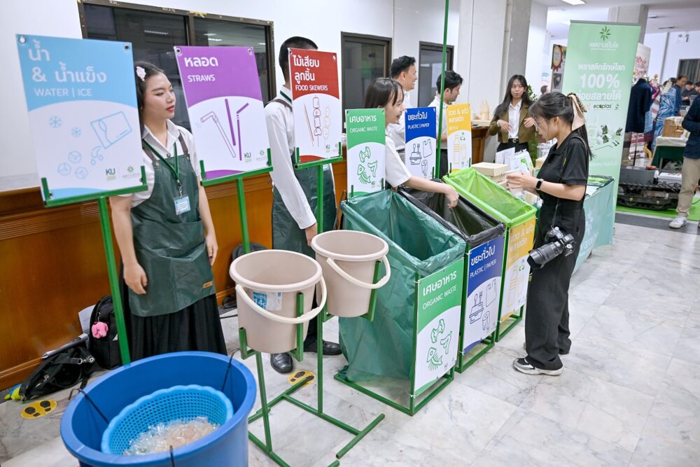 สำหรับการจัดงานเกษตรแฟร์ปีนี้ มหาวิทยาลัยเกษตรศาสตร์ได้ออกแบบการจัดการขยะในเชิงระบบ ตั้งแต่ต้นทาง กลางทาง และปลายทาง โดยจัดตั้งจุดคัดแยกขยะรวม 25 จุด ครอบคลุมพื้นที่งานทั้งหมด แบ่งเป็นจุดคัดแยกขยะหลัก (จุด A) จำนวน 15 จุด ซึ่งมีนิสิตและบุคลากรประจำจุดคอยให้คำแนะนำแก่ผู้ร่วมงาน และจุดคัดแยกขยะย่อย (จุด B) อีก 10 จุด เพื่ออำนวยความสะดวกให้ผู้เข้าร่วมงานสามารถคัดแยกขยะได้ด้วยตนเองอย่างถูกต้อง