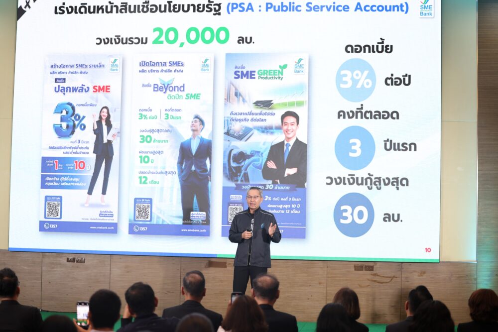 ทั้งนี้ “ด้านการเงิน” จัดเตรียมบริการสอดคล้องกับพันธกิจธนาคารที่มุ่งสนับสนุนเอสเอ็มอีรายใหม่ขนาดเล็กให้เข้าถึงแหล่งทุน ผ่าน 3 ผลิตภัณฑ์สินเชื่อสำคัญ อัตราดอกเบี้ยพิเศษเพียง 3%ต่อปี คงที่ตลอด 3 ปีแรก ผ่อนนานสูงสุด 10 ปี วงเงินรวมกว่า 20,000 ล้านบาท ตอบโจทย์นำไปลงทุน ขยาย ปรับปรุงกิจการ หรือหมุนเวียนเสริมสภาพคล่อง ช่วยยกระดับธุรกิจ ได้แก่ โครงการ “สินเชื่อ ปลุกพลัง SME” สร้างโอกาสให้ผู้ประกอบการรายเล็กเข้าถึงแหล่งทุน วงเงินกู้สูงสุดไม่เกิน 1 ล้านบาท ไม่ต้องใช้หลักทรัพย์ค้ำประกัน , โครงการ “สินเชื่อ Beyond ติดปีก SME” มุ่งเพิ่มศักยภาพยกระดับธุรกิจ วงเงินกู้สูงสุดไม่เกิน 30 ล้านบาท และ “สินเชื่อ SME Green Productivity” สนับสนุนเปลี่ยนผ่านสู่ธุรกิจสีเขียว วงเงินกู้สูงสุดไม่เกิน 30 ล้านบาทควบคู่กับ “ด้านการพัฒนา” ผ่านโปรแกรมพัฒนาทั้งออนไซต์และออนไลน์ที่เข้มข้นและเชิงลึก เน้นเสริมศักยภาพธุรกิจเอสเอ็มอี ให้ก้าวทันโลกยุคดิจิทัล พร้อมเปลี่ยนผ่านสู่ธุรกิจสีเขียว ทันเทรนด์เทคโนโลยี AI การเงินเชิงกลยุทธ์ และโอกาสเจาะตลาดใหม่ อีกทั้ง ช่วยทำตลาดเชิงรุก นอกจากนั้น ยังให้ความสำคัญ ในการดูแลลูกค้ากลุ่มเปราะบาง (Special Mention : SM) ด้วยการติดตามดูแลช่วยเหลืออย่างใกล้ชิด สอบถามก่อนเกิดปัญหา และช่วยบ่มเพาะเพิ่มศักยภาพ สร้างโอกาสให้ธุรกิจกลับมาเดินหน้าต่อไปได้ดีในอนาคต