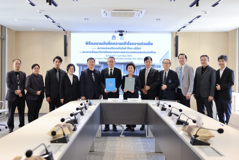 วันที่ 3 กุมภาพันธ์ 2569 ธนาคารพัฒนาวิสาหกิจขนาดกลางและขนาดย่อมแห่งประเทศไทย (ธพว.) หรือ SME D Bank โดย นายพิชิต มิทราวงศ์ กรรมการผู้จัดการ และ สมาคมส่งเสริมเทคโนโลยี (ไทย-ญี่ปุ่น) หรือ ส.ส.ท. โดย รองศาสตราจารย์ ปราณี จงสุจริตธรรม นายก ส.ส.ท. ร่วมลงนามบันทึกข้อตกลงความร่วมมือ “การพัฒนาและสนับสนุนผู้ประกอบการเพื่อยกระดับศักยภาพ SMEs” เพื่อส่งเสริมผู้ประกอบการเอสเอ็มอี นำเทคโนโลยีและนวัตกรรม มาประยุกต์ใช้ต่อยอดธุรกิจ สร้างการเติบโตอย่างยั่งยืน พร้อมก้าวสู่อุตสาหกรรมแห่งอนาคต ณ ห้องประชุม Board Room ชั้น 3 อาคารสมาคมส่งเสริมเทคโนโลยี (ไทย-ญี่ปุ่น)