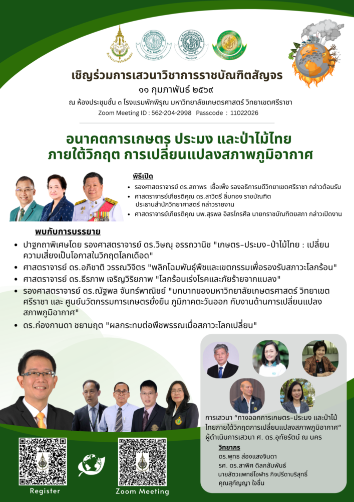สำนักวิทยาศาสตร์ ราชบัณฑิตยสภา ร่วมกับ มหาวิทยาลัยเกษตรศาสตร์ วิทยาเขตศรีราชา คณะประมง และสถาบันวิจัยและพัฒนาแห่งมหาวิทยาลัยเกษตรศาสตร์ จัดเสวนาวิชาการราชบัณฑิตสัญจร เรื่อง “อนาคตการเกษตร ประมง และป่าไม้ไทย ภายใต้วิกฤติการเปลี่ยนแปลงสภาพภูมิอากาศ” ในวันที่ 11 กุมภาพันธ์ 2569 เวลา 09.30–16.00 น. ณ โรงแรมพักพิรุณ มหาวิทยาลัยเกษตรศาสตร์ วิทยาเขตศรีราชา และถ่ายทอดสดผ่านระบบออนไลน์ (Zoom) เพื่อวิเคราะห์ผลกระทบเชิงโครงสร้างของวิกฤติภูมิอากาศต่อภาคการผลิตหลักของประเทศ และสังเคราะห์แนวทางเชิงนโยบายที่สามารถนำไปใช้ได้จริง