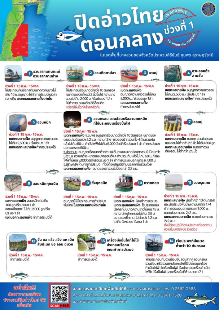 ประกาศฉบับใหม่ยังคงบังคับใช้ในพื้นที่และระยะเวลาตามเดิม คือ 3 เขตมาตรการ ใน 2 ช่วงเวลา ดังนี้ เขตมาตรการที่ 1 (ระหว่างวันที่ 15 กุมภาพันธ์ – 15 พฤษภาคม 2569) ครอบคลุมพื้นที่ตั้งแต่ปลายแหลมเขาม่องไล่ จังหวัดประจวบคีรีขันธ์ ถึงอำเภอดอนสัก จังหวัดสุราษฎร์ธานี เพื่อคุ้มครองและปกป้องพ่อแม่พันธุ์สัตว์น้ำให้มีโอกาสสืบพันธุ์ วางไข่ และเลี้ยงตัวอ่อน