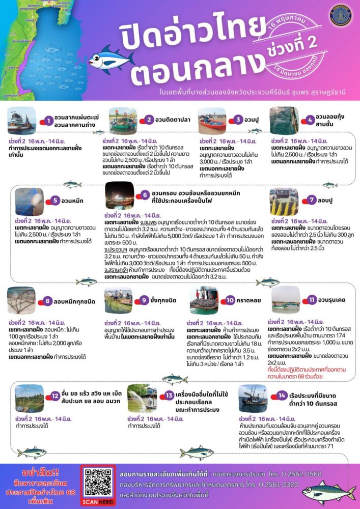 2) ประกาศกรมประมง เรื่อง กำหนดพื้นที่และระยะเวลาฤดูสัตว์น้ำมีไข่ หรือวางไข่ เลี้ยงตัวอ่อนในที่จับสัตว์น้ำบางส่วนของจังหวัดประจวบคีรีขันธ์ พ.ศ. 2568 ลงวันที่ 22 มกราคม 2568