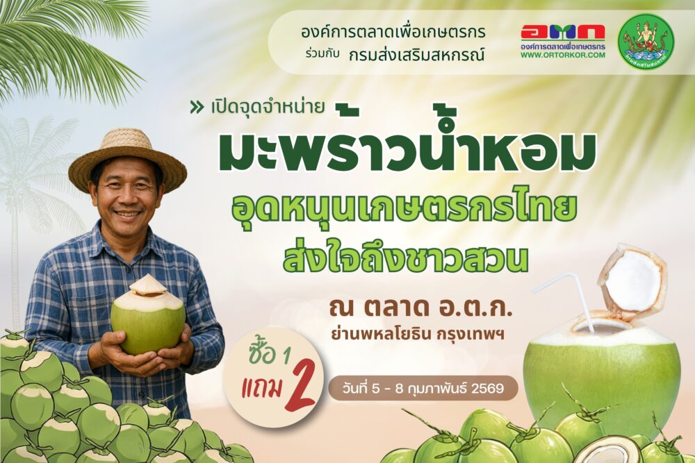 โดยองค์การตลาดเพื่อเกษตรกร (อ.ต.ก.) ร่วมกับกรมส่งเสริมสหกรณ์ เปิดพื้นที่ให้เกษตรกรผู้ปลูกมะพร้าวน้ำหอมจาก อำเภอดำเนินสะดวก จังหวัดราชบุรี นำผลผลิตมาจำหน่าย ในราคาลูกละ 15 บาท พร้อมกับโปรโมชั่น ซื้อ 1 แถม 2 และมีน้ำมะพร้าวบรรจุขวดพร้อมดื่ม มาจำหน่ายในราคาขวดละ 30 บาท พิเศษ 4 ขวดจ่ายเพียง 100 บาท เริ่มจำหน่ายระหว่างวันที่ 5 – 8 กุมภาพันธ์ 2569 ณ โซนสันทนาการ (พื้นที่กลางตลาด) ตลาด อ.ต.ก. จตุจักร กรุงเทพฯ นอกจากนี้ อ.ต.ก. ยังเร่งกระจายผลผลิตไปยัง อ.ต.ก.ส่วนภูมิภาค เพื่อระบายผลผลิตออกนอกพื้นที่ แก้ไขปัญหาและพยุงราคามะพร้าวหน้าสวนให้อนาคตขยับตัวสูงขึ้น