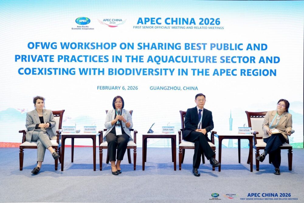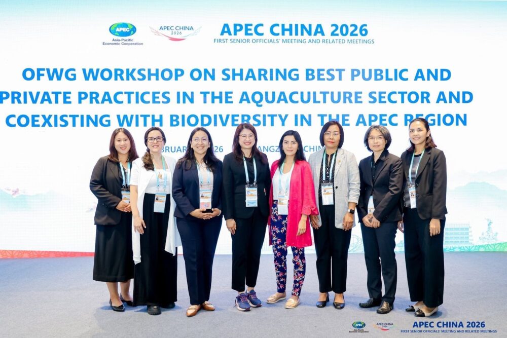 วันที่ 6 กุมภาพันธ์ 2569 นางฐิติพร หลาวประเสริฐ อธิบดีกรมประมง นำคณะผู้แทนประเทศไทยเข้าร่วม การประชุมเชิงปฏิบัติการเพื่อแลกเปลี่ยนแนวปฏิบัติที่ดีในการเพาะเลี้ยงสัตว์น้ำอย่างยั่งยืนระหว่างภาครัฐและภาคเอกชนในเขตเศรษฐกิจเอเปค หรือ APEC Region ซึ่งจัดขึ้นภายใต้กรอบความร่วมมือของคณะทำงานด้านมหาสมุทรและการประมงเอเปค ( OFWG) และเป็นส่วนหนึ่งของการประชุมผู้นำเขตเศรษฐกิจเอเปค 2026 (APEC 2026) ณ ศูนย์การประชุมนานาชาติไป่หยุน เมืองกว่างโจว สาธารณรัฐประชาชนจีน