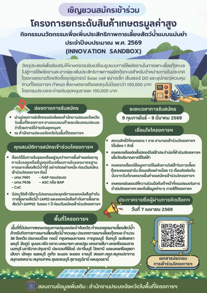 กรมประมงเปิดรับสมัครเกษตรกรผู้เลี้ยงกุ้งทะเล เข้าร่วมโครงการยกระดับสินค้าเกษตรมูลค่าสูง ภายใต้กิจกรรมนวัตกรรมเพื่อเพิ่มประสิทธิภาพการเลี้ยงสัตว์น้ำแบบแม่นยำ ประจำปีงบประมาณ พ.ศ. 2569 เพื่อเสริมการประยุกต์ใช้พลังงานสะอาดควบคู่เทคโนโลยีอัจฉริยะ หวังยกระดับการบริหารจัดการฟาร์มกุ้งทะเลให้มีความแม่นยำ ได้มาตรฐาน และเป็นมิตรต่อสิ่งแวดล้อม สอดคล้องกับแนวทางการพัฒนาภาคประมงสู่เศรษฐกิจสีเขียว เผยผู้ที่ผ่านการคัดเลือกและได้รับการตรวจสอบการติดตั้งนวัตกรรมแล้วเสร็จ จะได้รับการสนับสนุนงบประมาณจากกรมประมง รายละ 100,000 บาท สมัครได้เลยถึงวันที่ 9 มีนาคม 2569 นี้