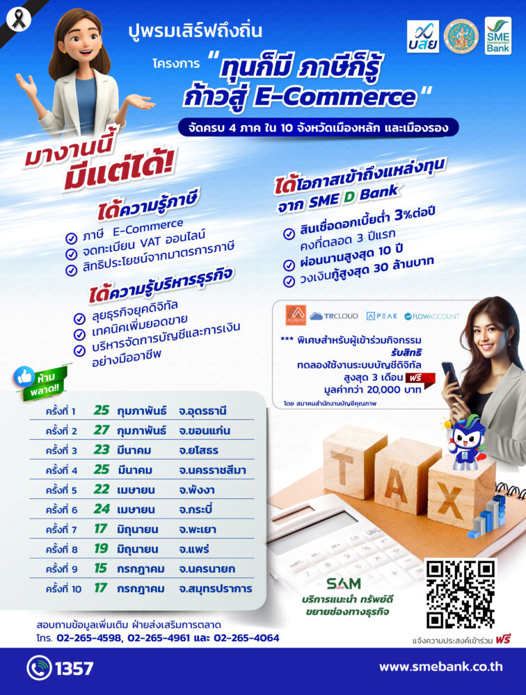 SME D Bank เดินหน้าภารกิจธนาคารเพื่อการพัฒนา ผนึกกำลัง กรมสรรพากร และ บสย. ลุยโครงการ “ทุนก็มี ภาษีก็รู้ ก้าวสู่ E-Commerce” ปูพรมเสริมแกร่งเอสเอ็มอีให้ก้าวทันการดำเนินธุรกิจในยุคดิจิทัล ผ่านการจัดงานในรูปแบบ ONE Stop Service เติมเต็มความรู้การเงิน ใช้ประโยชน์จากภาษี เพิ่มทักษะขยายตลาดอีคอมเมิร์ซ และผลักดันเข้าถึงแหล่งทุนดอกเบี้ยพิเศษ ไม่ต้องใช้หลักทรัพย์ค้ำประกัน กำหนดจัด 10 ครั้ง ใน 10 จังหวัดทั่วประเทศ ระหว่างเดือน ก.พ.-ก.ค. 2569 นี้ เปิดกว้างเข้าร่วมฟรี ไม่มีค่าใช้จ่ายใดๆ ทั้งสิ้น