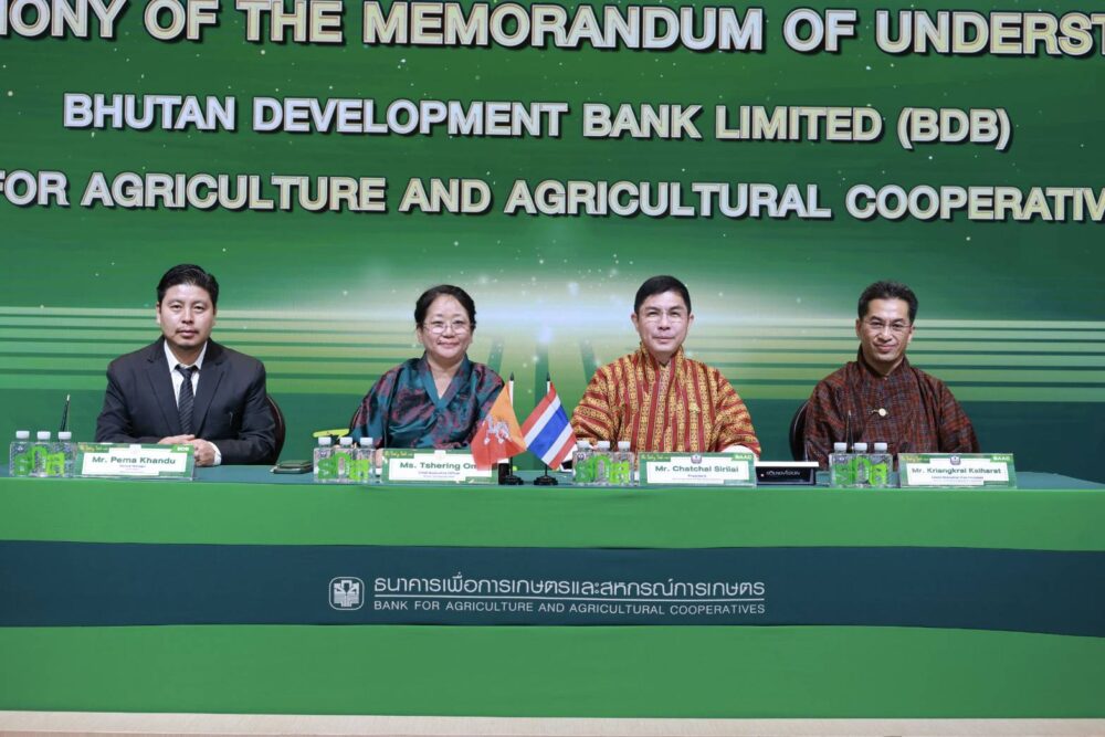 วันที่ 13 กุมภาพันธ์ 2569 นายฉัตรชัย ศิริไล ผู้จัดการธนาคารเพื่อการเกษตรและสหกรณ์การเกษตร (ธ.ก.ส.) และ Ms. Tshering Om CEO Development Bank Limited (BDB) ร่วมลงนามบันทึกความเข้าใจระหว่าง ธ.ก.ส. และธนาคารเพื่อการพัฒนาภูฏาน จำกัด เพื่อยกระดับการพัฒนาและเชื่อมโยงธุรกิจอย่างเป็นระบบ ควบคู่กับการเพิ่มประสิทธิภาพการทำธุรกรรมโอนเงินระหว่างประเทศ การสนับสนุนสินเชื่อเพื่อธุรกิจการเกษตร ธุรกิจวิสาหกิจขนาดกลางและขนาดย่อย (Agri-SME) และการอำนวยความสะดวกให้แก่ผู้ประกอบการและธุรกิจการค้าในระดับสากลให้มีความคล่องตัว รวดเร็ว และปลอดภัย