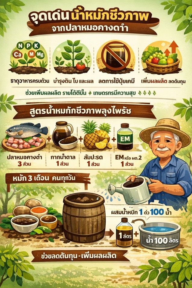 จุดเด่นของน้ำหมักชีวภาพจากปลาหมอคางดำ คือการเป็นแหล่งธาตุอาหารธรรมชาติ ทั้งธาตุหลักและธาตุรอง ช่วยบำรุงดิน ใบ และผลอย่างสมดุล เมื่อใช้สม่ำเสมอสามารถลดการพึ่งพาปุ๋ยเคมีได้ชัดเจน ต้นทุนการผลิตลดลง ขณะที่คุณภาพผลผลิตกลับเพิ่มขึ้น ส่งผลโดยตรงต่อรายได้ของเกษตรกร