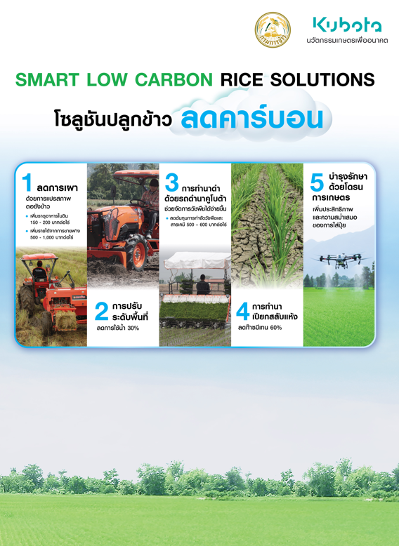 สยามคูโบต้าฯ จับกรมการข้าว เปิดตัว “พิจิตรแซนบ็อกซ์” ต้นแบบนาดำคาร์บอนต่ำ พาชาวนาไทยเปลี่ยนระบบทำนา จากนาหว่านสู่นาดำด้วยวิธีปลูกแบบเปียกสลับแห้งที่เป็นมิตรต่อสิ่งแวดล้อม ต่อยอดสร้างรายได้เพิ่มจากคาร์บอนเครดิตในอนาคต เพื่อผลักดันข้าวคาร์บอนต่ำให้สามารถทำได้จริง มุ่งสู่เป้าหมาย Net Zero ปี 2050 และนโยบายข้าวคาร์บอนต่ำ 1 ล้านไร่ ปักหมุดพิจิตรเป็นจุดตั้งต้นแห่งการยกระดับข้าวไทยทั้งระบบ ตั้งเป้านาดำคาร์บอนต่ำ 5,000 ไร่ เดินหน้าพัฒนามิติสิ่งแวดล้อม เศรษฐกิจ และคุณภาพชีวิตของเกษตรกร เพิ่มขีดความสามารถการแข่งขันในตลาดโลกอย่างยั่งยืน