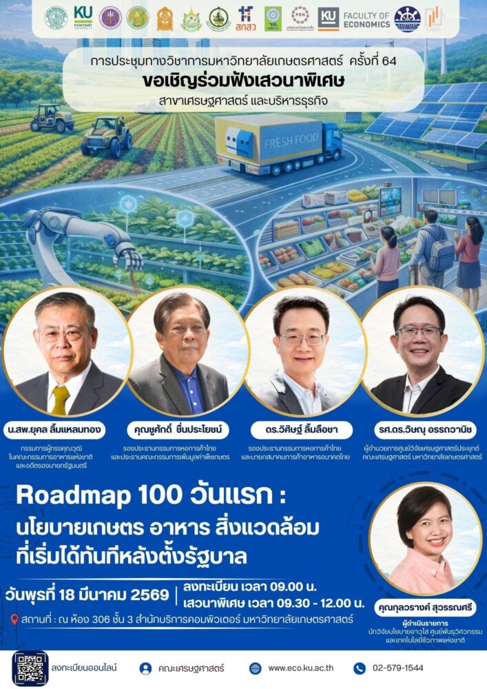 ในโอกาส จึงขอเชิญชวนผู้สนใจร่วมรับฟังเสวนาพิเศษสาขาเศรษฐศาสตร์และบริหารธุรกิจ เรื่อง “Roadmap 100 วันแรก: นโยบายเกษตร อาหาร สิ่งแวดล้อมที่เริ่มได้ทันทีหลังตั้งรัฐบาล” ในงานการประชุมทางวิชาการมหาวิทยาลัยเกษตรศาสตร์ ครั้งที่ 64 ภายใต้แนวคิด“บูรณาการนวัตกรรมและสังคม: ก้าวสู่อนาคตที่ชาญฉลาดและยั่งยืน” ในวันที่ 18 มีนาคม 2569 เวลา 09.00 –