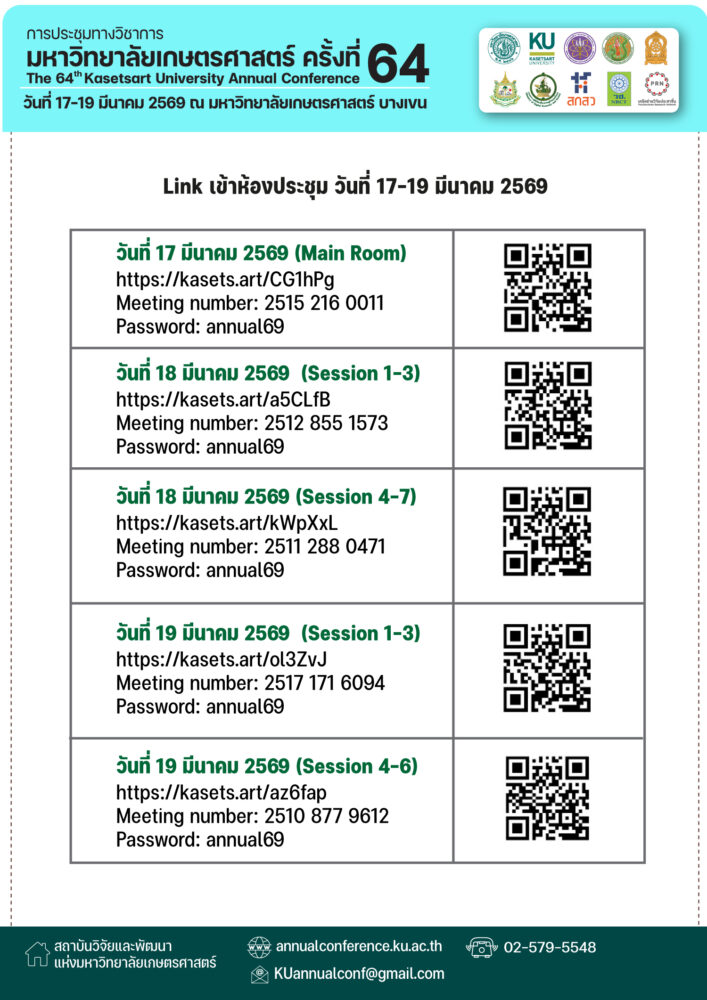 ผู้สนใจสามารถเข้าร่วมแบบออนไลน์ผ่านระบบ Webex Meeting (Meeting Number: 2511 288 0471, Password: annual69 (Session 5)) หรือสแกนคิวอาร์โค้ดที่ปรากฏในโปสเตอร์ประชาสัมพันธ์เพื่อเข้าสู่ระบบการประชุมได้โดยตรง