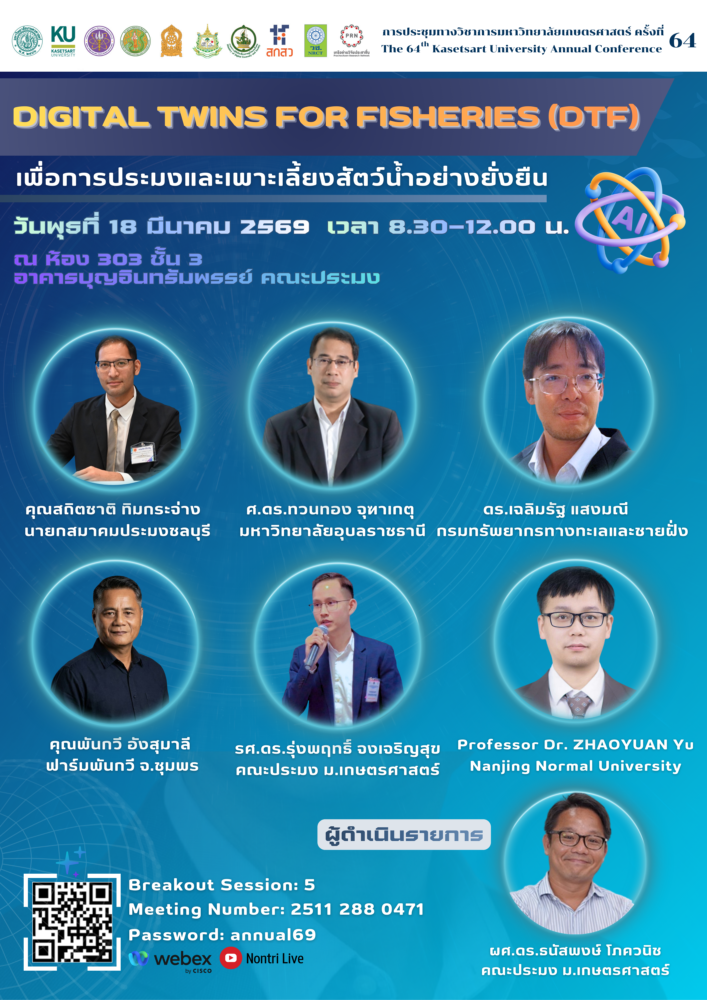 ทางมหาวิทยาลัยเกษตรศาสตร์ ขอเชิญผู้สนใจร่วมรับฟังเสวนาพิเศษ สาขาประมง เรื่อง “Digital Twins for Fisheries (DTF) เพื่อการประมงและเพาะเลี้ยงสัตว์น้ำอย่างยั่งยืน” ในงานการประชุมทางวิชาการมหาวิทยาลัยเกษตรศาสตร์ ครั้งที่ 64 ภายใต้แนวคิด “บูรณาการนวัตกรรมและสังคม: ก้าวสู่อนาคตที่ชาญฉลาดและยั่งยืน” ในวันที่ 18 มีนาคม 2569 เวลา 08.30 – 12.00 ณ ห้องบรรยาย 303 ชั้น 3 อาคารบุญอินทรัมพรรย์ คณะประมง มหาวิทยาลัยเกษตรศาสตร์ พร้อมรับชมการถ่ายทอดสดผ่านระบบ Webex Breakout Session 5 และ Youtube : Nontri Live