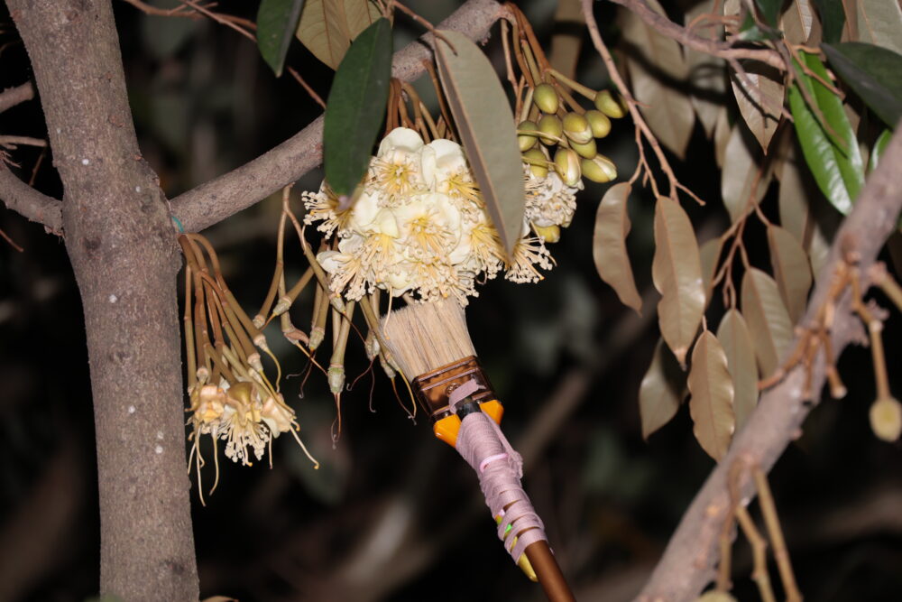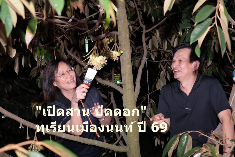 วิธีนี้จะทำให้การผสมเกสรสมบูรณ์มากขึ้น เปอร์เซ็นต์การติดผลสูงขึ้น ส่งผลให้รูปทรงของผลทุเรียนสวยงาม ไม่บิดเบี้ยว มีพูมาก เป็นลักษณะเฉพาะของทุเรียนคุณภาพ ซึ่งภายหลังจากผสมเกสรแล้ว เกษตรกรจะบันทึกวันผสมเกสรไว้ทุกช่อ ทุกต้น เพื่อความแม่นยำในการตัดทุเรียน โดยปีนี้ผลผลิตทุเรียนนนท์จะเริ่มออกจำหน่ายตั้งแต่เดือนเมษายน 2569 เป็นต้นไป ใช้เวลา 90 – 120 วัน จากวันที่ทำการผสมเกสร เกษตรกรก็จะได้ทุเรียนสุกพอดี