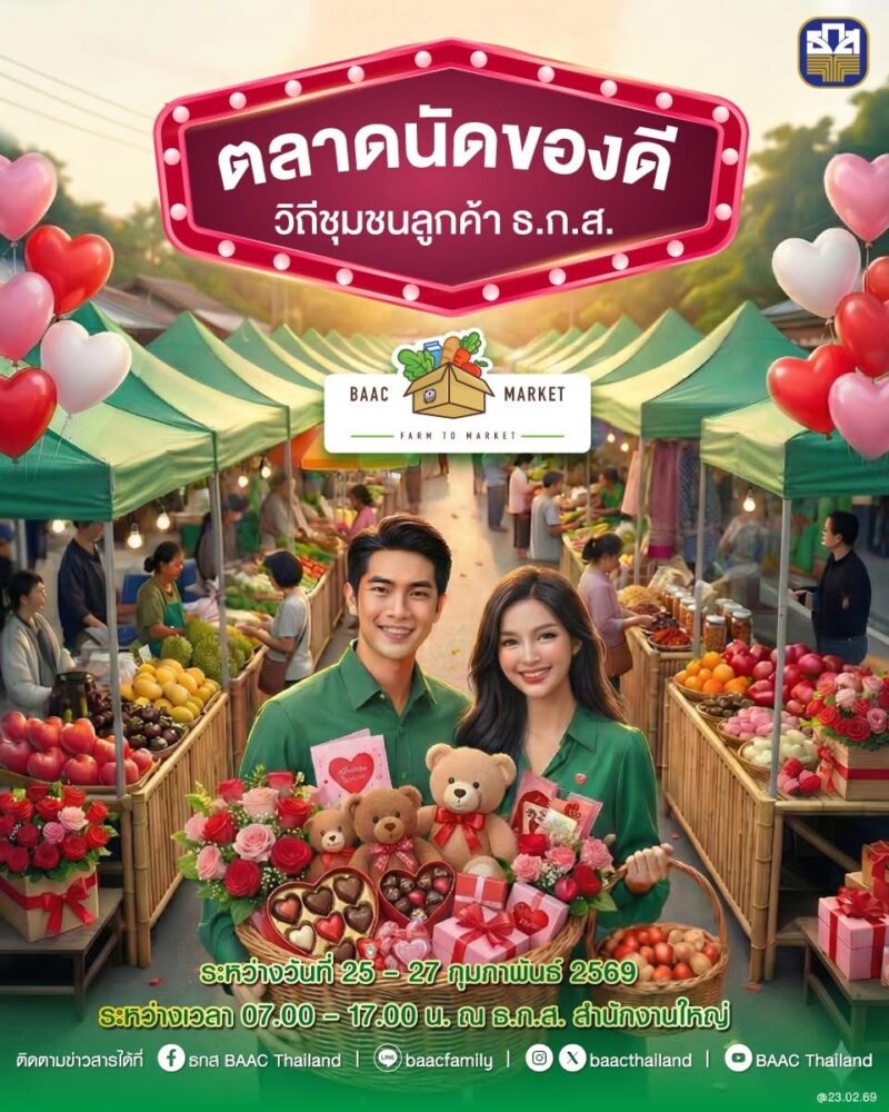 ธ.ก.ส. ส่งท้ายเดือนแห่งความรักด้วยตลาดนัดของดีวิถีชุมชน ภายใต้ธีม “เดือนแห่งความรัก Month of Love” ที่นำสินค้าเกษตรและผลิตภัณฑ์ชุมชนแบบติดแกลมจากเกษตรกรลูกค้าทั่วประเทศกว่า 60 ร้านค้า มาให้เลือกซื้อเพื่อมอบให้คนพิเศษ นอกจากนี้ยังมีโซนอาหาร เครื่องดื่ม และถ่ายภาพเช็กอินกับโฟโต้บุ๊ค ระหว่างวันที่ 25 – 27 กุมภาพันธ์ 2569 ณ บริเวณด้านหน้า ธ.ก.ส. สำนักงานใหญ่ กรุงเทพฯ