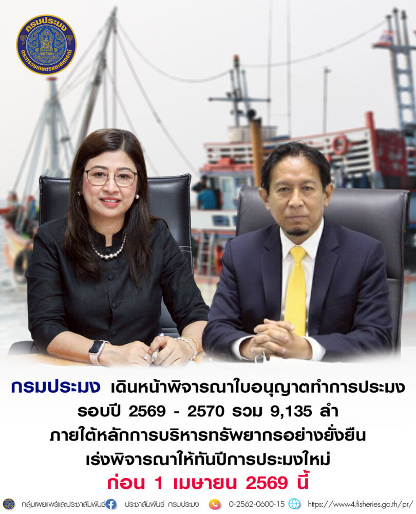 กรมประมง เร่งพิจารณาผลการออกใบอนุญาตทำการประมง ทั้งพาณิชย์และพื้นบ้าน ให้ทันรอบปีการประมง 2569 – 2570 ก่อนวันที่ 1 เมษายน 2569 โดยมีผู้แจ้งความประสงค์ยื่นคำขอรับใบอนุญาต รวมทั้งสิ้น 9,135 ลำ แบ่งเป็น ใบอนุญาตทำการประมงพาณิชย์ จำนวน 8,139 ลำ และใบอนุญาตทำการประมงพื้นบ้าน จำนวน 996 ลำ ทั้งนี้ การพิจารณาออกใบอนุญาต จะต้องสอดคล้องกับปริมาณสัตว์น้ำสูงสุดที่สามารถทำการประมงได้อย่างยั่งยืน (MSY) ตามที่คณะกรรมการนโยบายการประมงแห่งชาติกำหนด