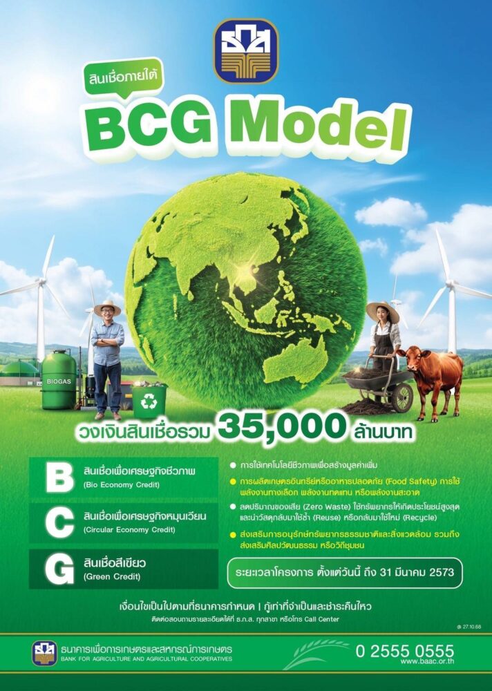 พร้อมสนับสนุนสินเชื่ออัตราดอกเบี้ยพิเศษ เพื่อสร้างความยั่งยืนในด้านพลังงานในภาคการเกษตรตามแนวทางการพัฒนาอย่างยั่งยืน ESG (Environmental, Social และ Governance) ผ่านสินเชื่อเพื่อเทคโนโลยีและเครื่องจักรกลการเกษตร (Smart Tech) อันนำไปสู่การเพิ่มขีดความสามารถในการแข่งขันและสร้างรายได้ให้กับผู้ประกอบการอย่างยั่งยืน ระยะเวลาชำระเงินกู้สูงสุดไม่เกิน 10 ปี นับตั้งแต่วันกู้เงิน และสินเชื่อ BCG Model ประกอบด้วย สินเชื่อเพื่อเศรษฐกิจชีวภาพ (Bio Economy Credit) สินเชื่อเพื่อเศรษฐกิจหมุนเวียน (Circular Economy Credit) สินเชื่อสีเขียว (Green Credit) กำหนดอัตราดอกเบี้ยพิเศษสำหรับลูกค้าที่ได้รับการรับรองมาตรฐาน