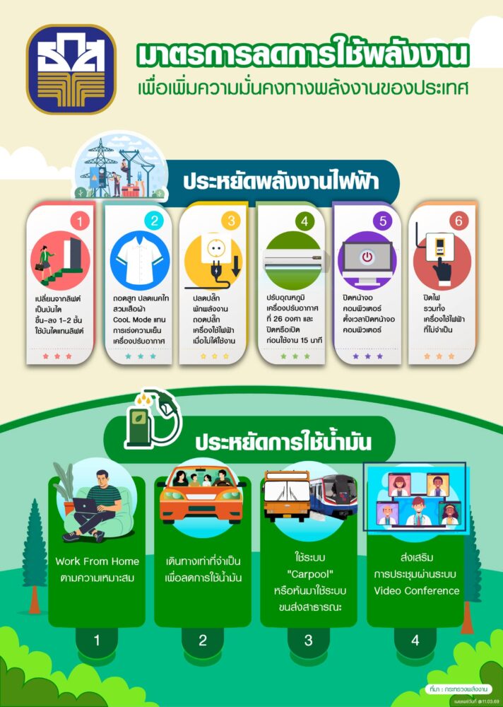 1) มาตรการประหยัดพลังงานไฟฟ้า ประกอบด้วย การใช้บันไดแทนลิฟต์ โดยรณรงค์ให้ใช้บันไดในการขึ้นและลง เพื่อลดการใช้ลิฟต์โดย ไม่จำเป็น การปรับเปลี่ยนการแต่งกาย โดยลดการใส่สูท ปลดเนคไท สวมเสื้อแขนสั้น และสวมใส่เสื้อผ้าเนื้อผ้าโปร่งสบาย (Cool Mode) เพื่อลดการทำงานหนักของเครื่องปรับอากาศ การจัดการปลั๊กไฟ โดยปลดปลั๊กเครื่องใช้ไฟฟ้าทุกชนิดเมื่อไม่ได้ใช้งาน และเลือกใช้โหมดพักพลังงาน