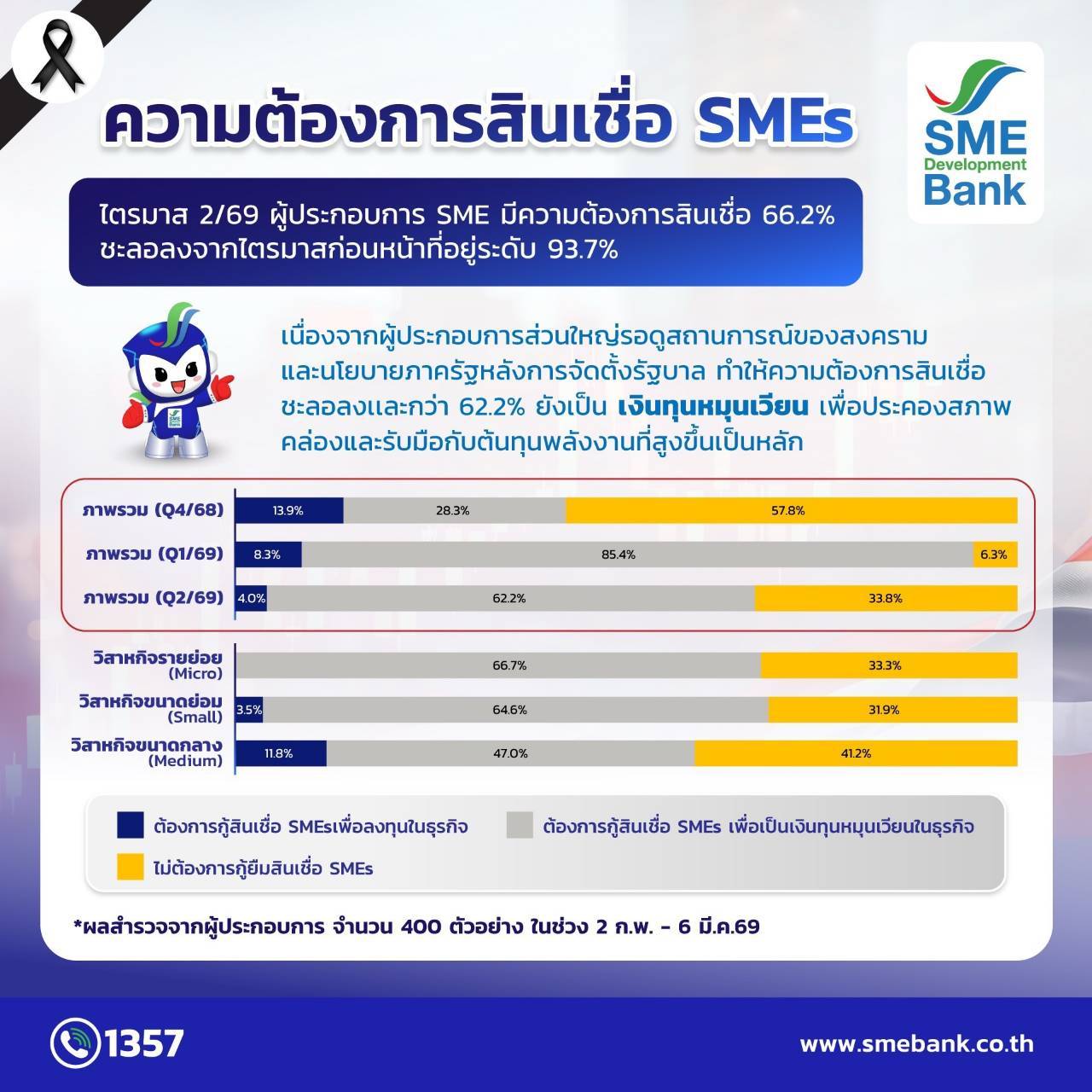 ขณะที่ คาดการณ์ 3 เดือนข้างหน้า หรือไตรมาส 2/69 ผู้ประกอบการเอสเอ็มอี มีความต้องการสินเชื่อ 66.2% ชะลอลงจากไตรมาสก่อนหน้าที่อยู่ระดับ 93.7% เนื่องจากผู้ประกอบการส่วนใหญ่รอดูสถานการณ์ของสงคราม และนโยบายภาครัฐหลังการจัดตั้งรัฐบาล ทำให้ความต้องการสินเชื่อของเอสเอ็มอีกว่า 62.2% ยังเป็นเงินทุนหมุนเวียน เพื่อประคองสภาพคล่องและรับมือกับต้นทุนพลังงานที่สูงขึ้นเป็นหลัก