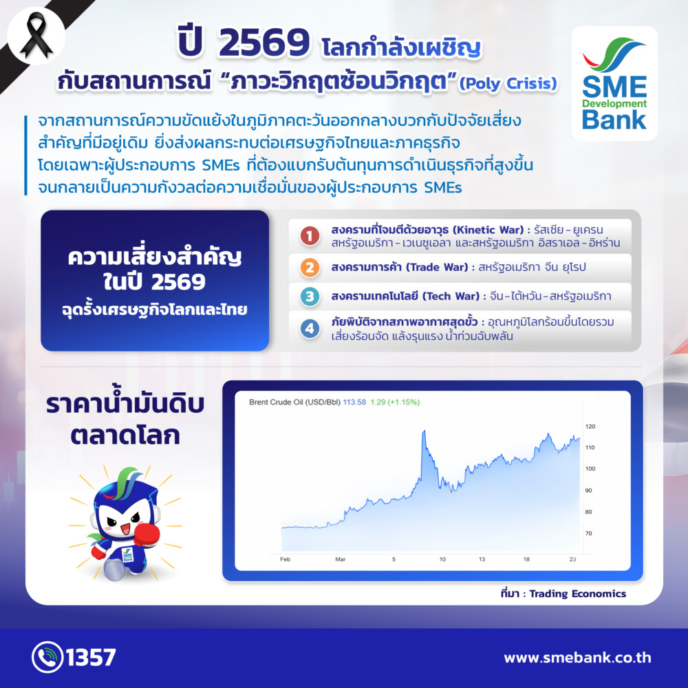SME D Bank เปิดผลสำรวจดัชนีความเชื่อมั่นผู้ประกอบการเอสเอ็มอีทั่วประเทศ ประจำไตรมาส 1/2569 พบปรับลดลงอย่างรุนแรง เหลือระดับ 50.2 จากไตรมาส 4/68 ที่อยู่ระดับ 68.9 เหตุกังวลราคาน้ำมันและต้นทุนการผลิตที่เพิ่มสูงขึ้น กระทบคำสั่งซื้อและการดำเนินธุรกิจ ประกาศแผนช่วยหลือเต็มกำลัง สอดคล้องกับนโยบายรัฐบาล จัดสินเชื่อดอกเบี้ยต่ำ 3% ต่อปี วงเงินรวม 20,000 ล้านบาท ช่วยลดภาระต้นทุนธุรกิจ พร้อมส่งเสริมปรับเปลี่ยนใช้พลังงานสะอาด เสริมศักยภาพแข่งขัน และสร้างการเติบโตยั่งยืนในระยะยาว ขณะเดียวกัน ออกมาตรการลดการใช้พลังงานภายในองค์กร