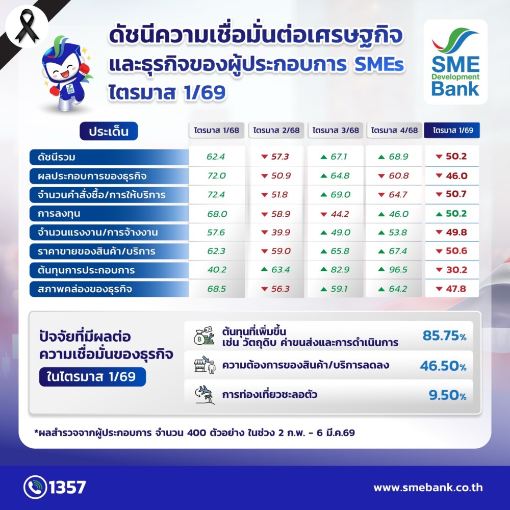ผลออกมาพบว่า ดัชนีความเชื่อมั่นรวมของผู้ประกอบการเอสเอ็มอี ประจำไตรมาส 1/69 อยู่ที่ระดับ 50.2 ลดลงจากไตรมาส 4/68 ที่อยู่ระดับ 68.9 เนื่องจากมีความกังวลต่อระดับราคาน้ำมันในประเทศที่จะปรับตัวสูงขึ้นจากผลกระทบของสงครามสหรัฐฯ กับอิหร่าน ส่งผลเชิงลบด้านต้นทุนการประกอบการ เช่น วัตถุดิบ ค่าขนส่งการดำเนินงาน รวมถึงผลกระทบต่อความเชื่อมั่นด้านคำสั่งซื้อ/บริการ ผลประกอบการที่ปรับลดลง และการท่องเที่ยวที่ชะลอตัว