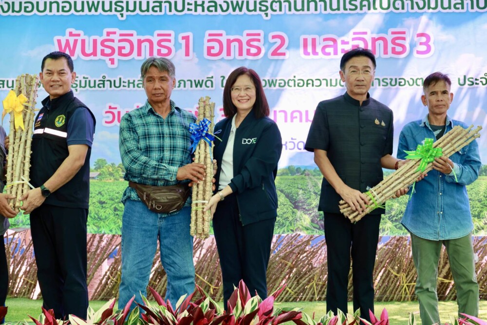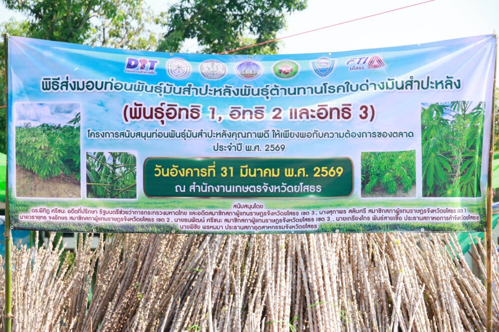 กรมส่งเสริมการเกษตร จัดกิจกรรมส่งมอบท่อนพันธุ์ต้านทานโรคใบด่าง ได้แก่ พันธุ์อิทธิ 1 อิทธิ 2 และอิทธิ 3 ให้เกษตรกรจังหวัดยโสธร ขับเคลื่อนการพัฒนามันสำปะหลังแบบครบวงจร ดึงเครือข่ายสมาคมมันสำปะหลัง 4 สมาคม เพื่อเร่งลดการระบาดของโรคและยกระดับคุณภาพผลผลิต ณ สำนักงานเกษตรจังหวัดยโสธร.