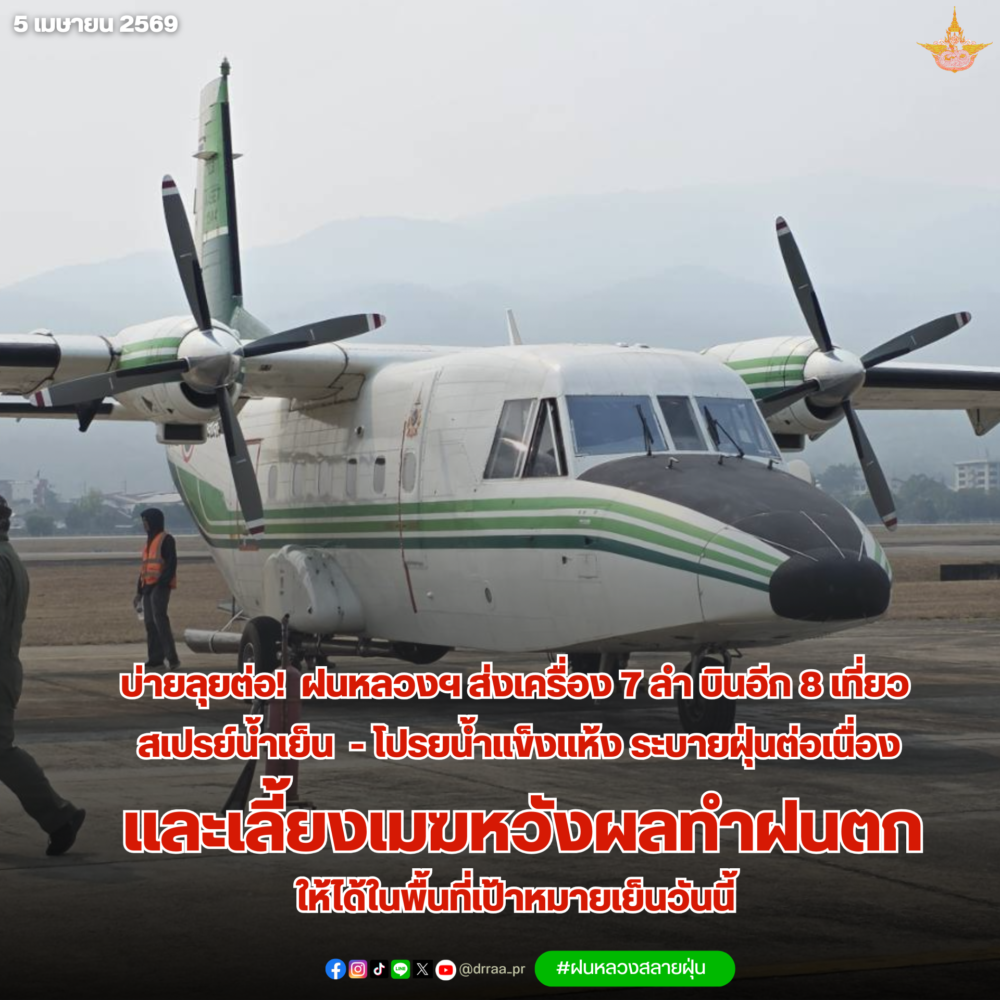 ฝนหลวงฯ ส่งเครื่องบิน 7 ลำ ปฏิบัติการอีก 8 เที่ยวบิน สเปรย์น้ำ-โปรยน้ำแข็งแห้ง ช่วงบ่ายวันอาทิตย์ เป้าหมายระบายฝุ่นต่อเนื่อง และเลี้ยงเมฆหวังผลทำฝนตกให้ได้ในพื้นที่เป้าหมายในตอนเย็นวันเดียวกัน