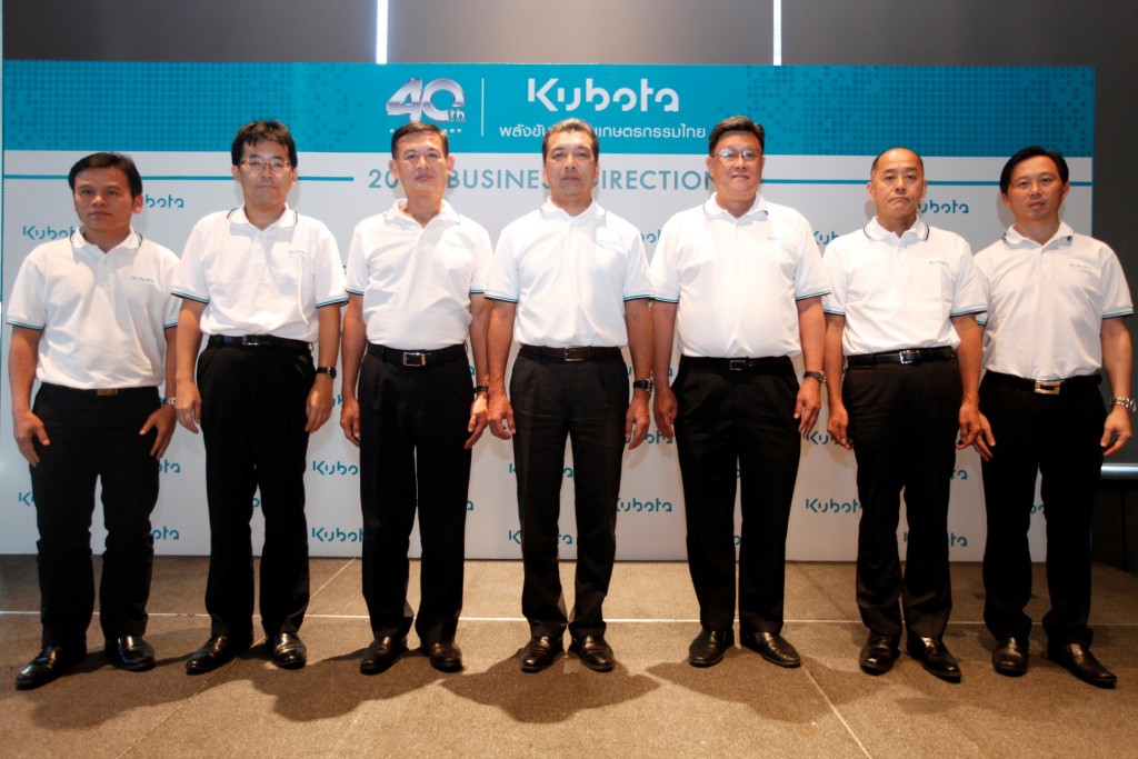 นายฮิโรโตะ คิมุระ กรรมการผู้จัดการใหญ่ บริษัทสยามคูโบต้าคอร์ปอเรชั่น จำกัด (ที่ 4 จากซ้าย) พร้อมด้วยนายสมศักดิ์ มาอุทธรณ์ (ที่ 3 จากขวา) กรรมการรองผู้จัดการใหญ่อาวุโส และคณะผู้บริหาร แถลงผลการดำเนินงานประจำปี 2560 ปิดยอดขายที่ 51,000 ล้านบาท ตั้งเป้ายอดขายในปี 2561 เติบโตขึ้น 10% พร้อมประกาศทิศทางการเดินหน้าธุรกิจสู่การเป็น “Global Major Brand” หรือ แบรนด์ชั้นนำระดับโลก ชูจุดเด่นด้านนวัตกรรมและเทคโนโลยีด้านการเกษตร ตอกย้ำการเป็นผู้นำตลาดที่อยู่เคียงข้างเกษตรกรไทยมา 40 ปี ณ โรงแรม ดิ โอกุระ เพรสทีจ กรุงเทพฯ เมื่อเร็วๆนี้