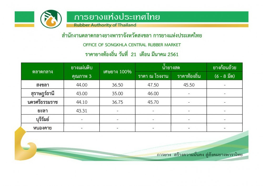 ราคายางในท้องถิ่นวันนี้(21 มี.ค.61) มีนาคม 21, 2018ดลมนัส กาเจราคายางพารา, สถานีข่าววันนี้ราคายางพารา, ราคายางวันนี้ [adrotate banner=”3″] ที่มา : การยางแห่งประเทศไทย