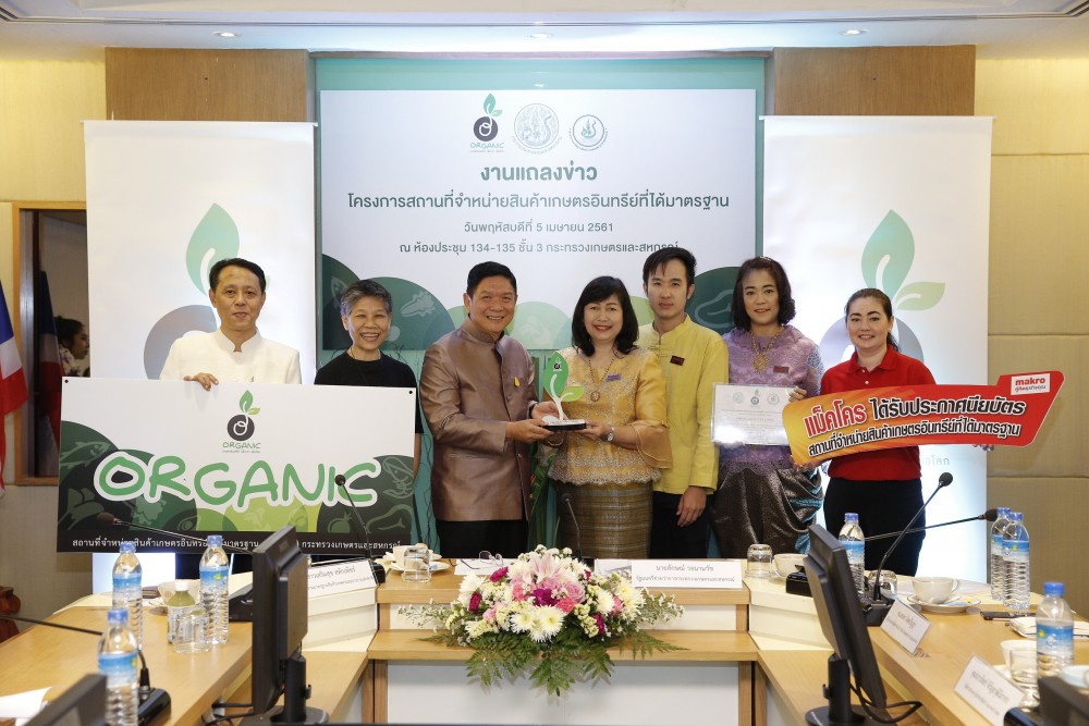 นายลักษณ์ วจนานวัช รัฐมนตรีช่วยว่าการกระทรวงเกษตรและสหกรณ์ (คนที่ 3 จากซ้าย)มอบโล่พร้อมประกาศนียบัตร ให้กับคุณจุฑารัตน์ พัฒนาทร (คนที่ 4 จากขวา) รองผู้อำนวยการฝ่ายประกันคุณภาพ บริษัท สยามแม็คโคร จำกัด (มหาชน) ณ กระทรวงเกษตรและสหกรณ์ เมื่อเร็ว ๆ นี้ เพื่อเป็นการรับรองแม็คโครเป็นสถานที่จำหน่ายสินค้าเกษตรอินทรีย์ที่ได้มาตรฐาน ปลอดภัย มีคุณภาพ และเป็นมิตรต่อสิ่งแวดล้อม ที่ได้รับการรับรองจากสำนักงานมาตรฐานสินค้าเกษตรและอาหารแห่งชาติ (มกอช) แล้วจำนวน 14 สาขา ได้แก่ สาขาลาดพร้าว สาขาแจ้งวัฒนะ สาขาศรีนครินทร์ สาขาบางบอน สาขารังสิต สาขาจรัญสนิทวงศ์ สาขาสาทรสาขาสามเสน สาขารามอินทรา สาขาคลองหลวง สาขาบางพลี สาขาบางบัวทอง สาขาหนองจอก และสาขาศรีนครินทร์ 2