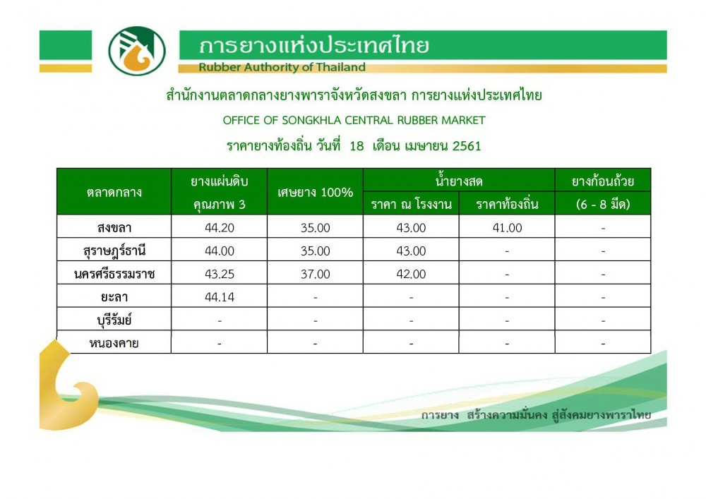ราคายางในท้องถิ่นวันนี้(18 เม.ย.61) เมษายน 18, 2018ดลมนัส กาเจราคายางพารา, สถานีข่าววันนี้ราคายางพารา, ราคายางวันนี้ ที่มา : การยางแห่งประเทศไทย [adrotate banner=”3″]