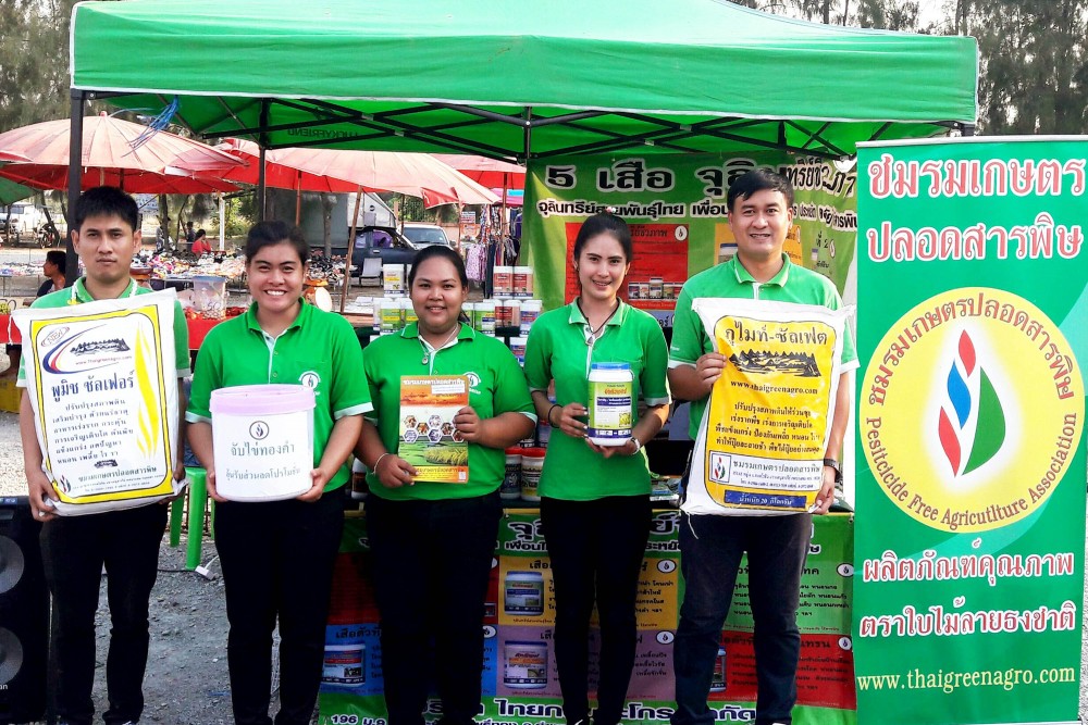 นายจตุโชค จันทรภูมี (ขวาสุด) ผู้ช่วยฝ่ายการตลาดบริษัท ไทยกรีน อะโกร จำกัด พร้อมทีมงานจัดกิจกรรมเดินสายจัดกิจกรรมภายใต้โครงการ “ชมรมเกษตรปลอดสารพิษสัญจร” เพื่อให้ความรู้ความเข้าใจ “ปฏิวัติทางความคิด ติดอาวุธทางปัญญา” ให้แก่เกษตรกร ในการ ลด ละ เลี่ยง เลิก การใช้สารพิษ ยาฆ่าแมลง และสารเคมีกำจัดศัตรูพืช พร้อมแนะและสาธิตเทคนิคการทำการเกษตรปลอดสารพิษ เช่น การหมักจุลินทรีย์จากวัสดุที่มีในท้องถิ่นโดยไม่ต้องหาซื้อ การเพาะเห็ดแบบปลอดสารพิษ รวมถึงแนะนำจุลินทรีย์ชีวภาพสายพันธุ์ไทย เพื่อเป็นทางเลือกที่ปลอดภัยทดแทนการใช้สารพิษ ณ ตลาดผักไห่ อำเภอผักไห่ จังหวัดพระนครศรีอยุธยา