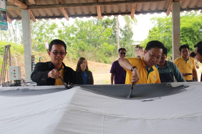 สอดคล้องกับนโนยายของรัฐบาลที่สนับสนุนให้มีการแปรรูปยางพาราใช้ภายในประเทศให้มากที่สุด กระทั่งเมื่อ 2 ปีก่อนทางสำนักงานกองทุนสนับสนุนเพื่องานวิจัย (สวก.)มีงานวิจัยภายใต้โครงการ “เทคโนโลยีการเคลือบสระน้ำ/บ่อน้ำ ด้วยน้ำยางธรรมชาติเสริมแรงด้วยผ้าด้ายดิบ” ได้ไปดำเนินโครงการทำบ่อน้ำขนาดใหญ่ โดยให้ผ้าดิบเครือบยางปูพื้นบ่อ เพื่อกักเก็บน้ำในพื้นที่