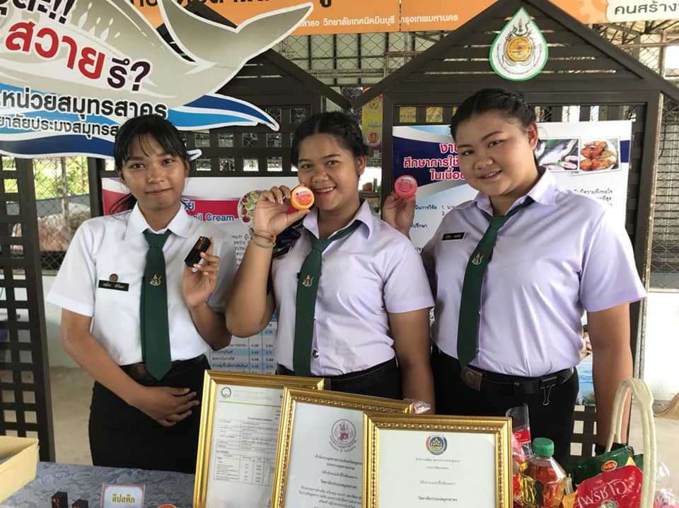 สำหรับวิทยาลัยประมงสมุทรสาคร สังกัดสำนักงานคณะกรรมการอาชีวศึกษา ที่ทำการวิจัยไขมันปลาสวายมาทำเป็นผลิตภัณฑ์ครีมบำรุงผิวและลิปสติกในครั้งนี้คือ “กฤษมงคล มีเจริญ “ โดยมี “เยาวรัตน์ โกรพบุรี” เป็นอาจารย์ที่ปรึกษา ทั้งนี้นักศักษาผู้วิจัยและอาจารย์ที่ปรึกษา มองว่าไขมันของปลาสวายนั้นมีโอเมก้า 3 สูงกว่าปลาชนิดอื่น คือมีโอเมก้า 3 สูงถึง 2,570 มิลลิกรัม ต่อน้ำหนัก 100 กรัม มากกว่าปลาทะเลอย่างปลาแซลมอนที่มีโอเมก้า 3 ราวๆ 1,000-1,700 มิลลิกรัมเท่านั้น ซึ่งโอเมก้า 3 นั้นเป็นกรดไขมันชั้นดี จึงใช้เทคนิคทำให้กลิ่นคาวหมดไปแต่ยังคงเก็บรักษาน้ำมันปลาที่คงประสิทธิภาพสูงสุด