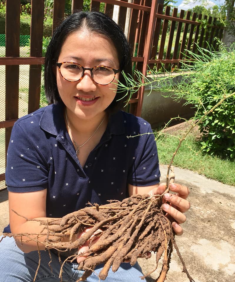 เธอ บอกด้วยว่า “รากสามสิบ” หรือ “สาวร้อยผัว” มีสรรคุณพิเศษ เป็นยาบำรุงสำหรับสตรี ตระตุ้นให้ฮอร์โมนเพศหญิงมีความคึกคัก กระปรี้กระเปร่า ทำให้ “อกฟูรูฟิต” ตลอดเวลา แม้อายุมีถึง 50 ปียังสามารถมีลูกมีผัวได้ กระนั้นข้อควรระวังสำหรับผู้หญิงที่ยังสาวและมีประวัติเกี่ยวกับการเป็นมะเร็วเต้านม เนื่องจากมีสารที่เลียนแบบฮอร์โมนเพศ ซึ่งปัจจุบันได้มีการนำรากหรือหัวของสามร้อยผัว มาตากแห้งและบดบรรจุแคปซูนจำหน่ายกันแล้ว จึงมองว่าเป็นช่องทางหนึ่งที่จะส่งเสริมเกษตรกรให้ปลูกในดินเค็ม ที่จะสามารถสร้างรายได้ให้กับเกษตรกรได้ (ดูในคลิปประกอบ)
