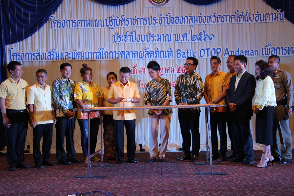 ผู้สื่อข่าวรายงานว่า วันนี้ (3 ก.ค. 61) ที่โรงแรมเมอร์ลิน อ.เมือง จ.ภูเก็ต นายนรภัทร ปลอดทอง ผู้ว่าราชการจังหวัดภูเก็ต เป็นประธานเปิดโครงการส่งเสริมพัฒนากลไกการตลาดผลิตภัณฑ์ Batik OTOP Andaman เพื่อการท่องเที่ยว ซึ่งเป็นการชูผ้าสายแร่-บาติก (Sano Tik) เป็นเอกลักษณ์ของจังหวัดภูเก็ต โดยมีนางสุดาวรรณ ปลอดทอง นายกเหล่ากาชาดจังหวัดภูเก็ต นายกิติพล เวชกุล พัฒนาการจังหวัดภูเก็ต ส่วนราชการที่เกี่ยวข้อง และผู้ประกอบการ เข้าร่วมโครงการ