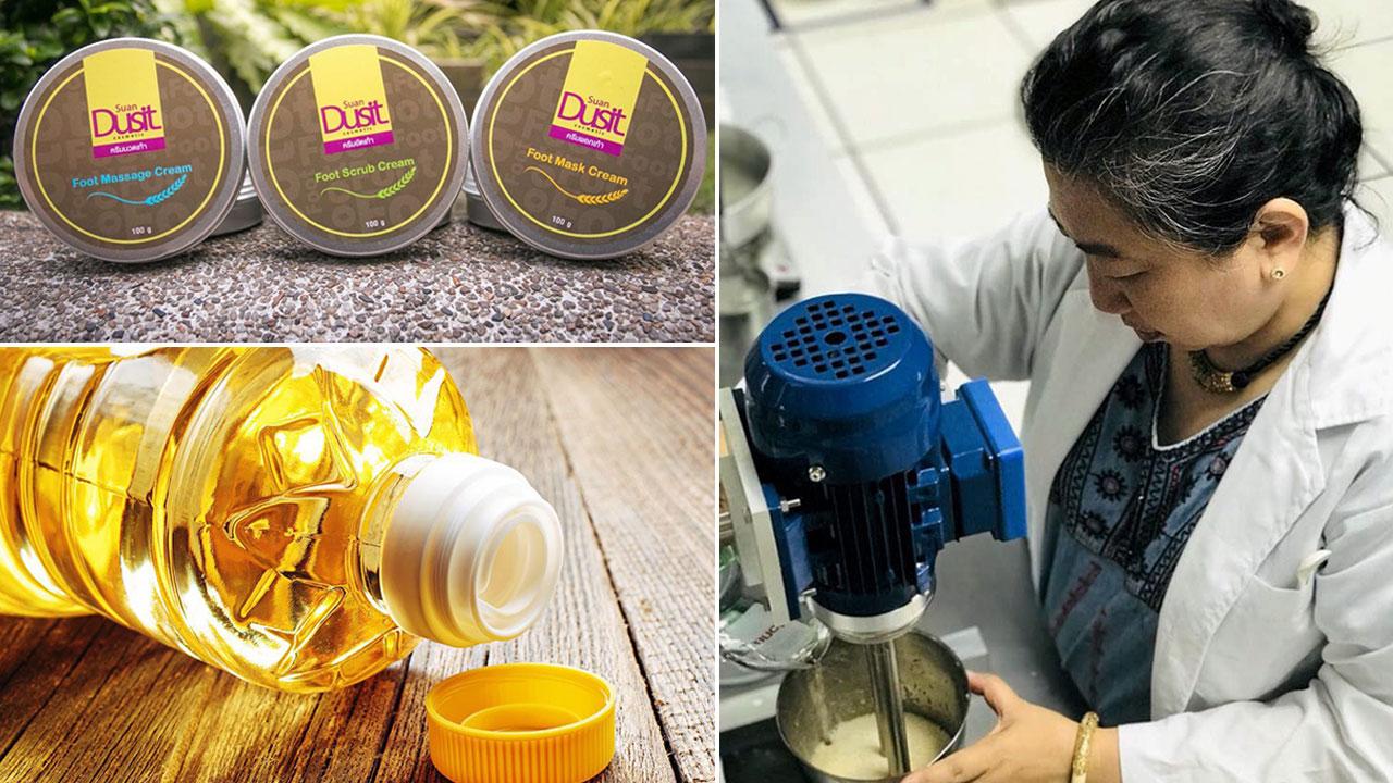 ”และเมื่อนำไปทดสอบกับกลุ่มอาสาสมัครในมหาวิทยาลัย…นอกจากช่วยแก้ปัญหาริ้วรอยแตก ลดการเกิดตาปลา ยังช่วยให้ผิวหนังบริเวณเท้านุ่ม และยังแก้ปัญหาเท้ามีกลิ่นเหม็นได้อีกด้วย ไขรำข้าว 1 กก. นำมาผสมสูตรครีมสปาเท้าได้ 200 ตลับ ขายได้ 32,000 บาท โดยมีต้นทุนการผลิตอยู่ที่ 8,000 บาท จากไขรำข้าวมีราคา กก.ละ 12 บาท แปรรูปเป็นครีมสปาเท้าได้มูลค่าเพิ่มถึง 2,000 เท่า สนใจสอบถาม 08–1300–2594.