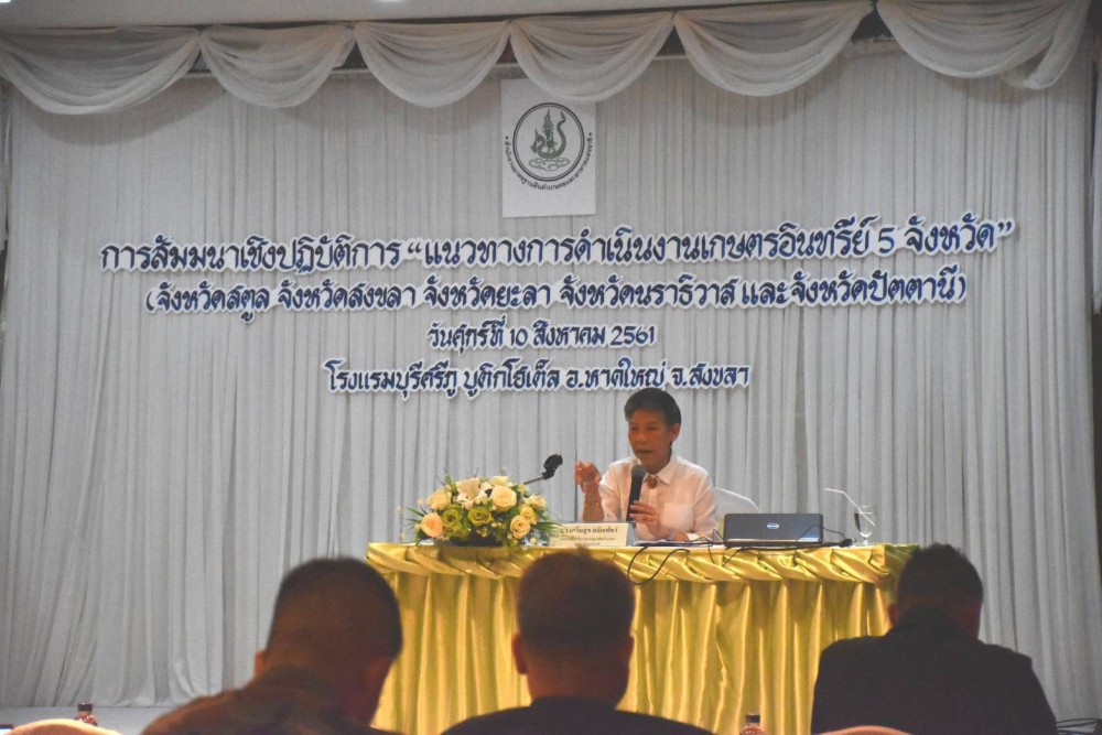 นางสาวเสริมสุข สลักเพ็ชร์ เลขาธิการสำนักงาน มกอช. กล่าวในการเป็นประธานเปิดการสัมมนาเชิงปฏิบัติการ “แนวทางการดำเนินงานเกษตรอินทรีย์ 5 จังหวัด” (จังหวัดสตูล จังหวัดสงขลา จังหวัดยะลา จังหวัดนราธิวาส และจังหวัดปัตตานี) ณ โรงแรมบุรีศรีภูบูติก อำเภอหาดใหญ่ จังหวัดสงขลา