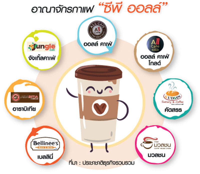 “ซีพี ออลล์” แตกแบรนด์ยึดตลาดกาแฟไม่หยุด ปั้นออลล์ คาเฟ่, ออลล์ คาเฟ่ โกลด์, คัดสรร, มวลชน, เบลลินี่, อาราบิเทีย และจังเกิ้ลคาเฟ่ ชิงส่วนแบ่งตลาดกาแฟ 3.8 หมื่นล้านพร้อมเคลื่อนทัพส่งตีตลาดต่างประเทศด้วยสูตรเร่งเติบโต “แฟรนไชส์” เปิดโมเดลราคาแฟรนไชส์เบา ๆ 4 แสนจูงใจตลาดกาแฟมูลค่าประมาณ 3.8 หมื่นล้านบาทโตแรงไม่หยุด ไม่เพียงเฉพาะในกลุ่มร้านพรีเมี่ยมที่ยึดสัดส่วน 20% ของตลาด แต่ยังรวมถึงรถเข็นกาแฟและทูอินวันที่ขยายตัวต่อเนื่อง