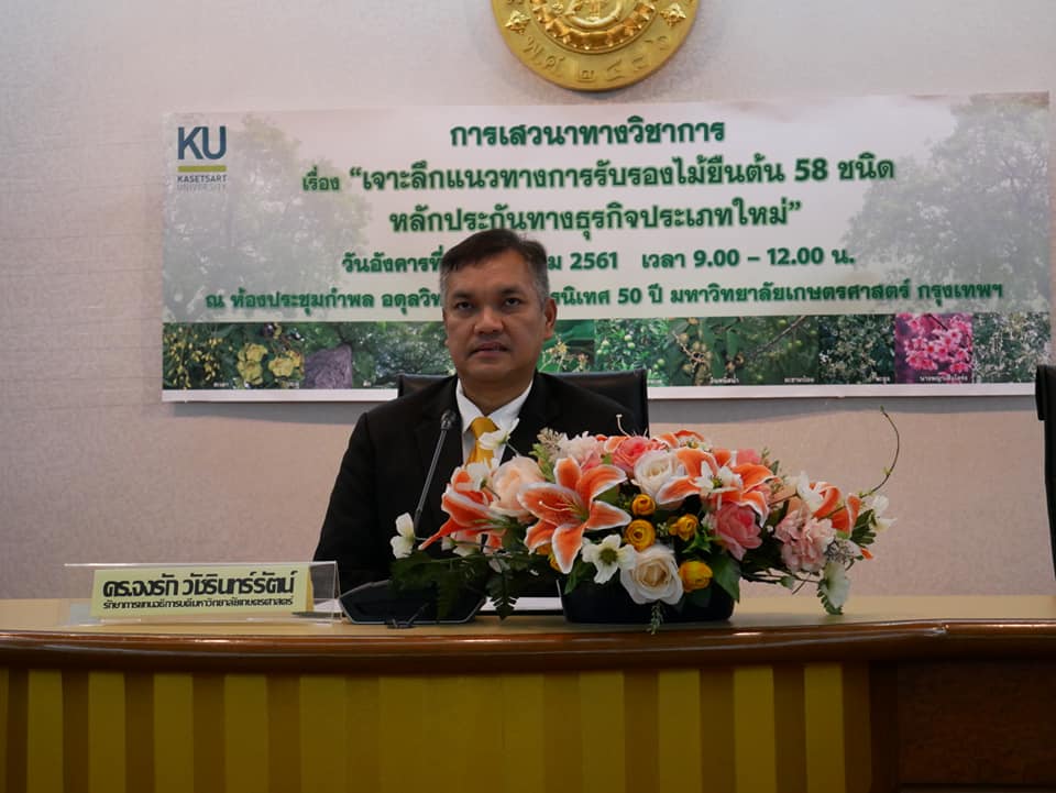 ดร.จงรัก วัชรินทร์รัตน์ รักษาการแทนอธิการบดีมหาวิทยาลัยเกษตรศาสตร์ เป็นประธานเปิดเวที “เจาะลึกแนวทางการรับรองไม้ยืนต้น 58 ชนิด หลักประกันทางธุรกิจประเภทใหม่” เพื่อเป็นเวทีสื่อสาธารณะในการให้บริการทางวิชาการแก่ประชาชน เสริมสร้างความเข้าใจที่ถูกต้องเกี่ยวกับการออกและปรับปรุงกฎหมาย ได้แก่ กฎกระทรวงกำหนดให้ทรัพย์สินอื่นเป็นหลักประกันทางธุรกิจ และการปรับปรุง พ.ร.บ.ป่าไม้ พุทธศักราช 2484 มาตรา 7 และมาตราอื่นที่เกี่ยวข้อง เพื่อการแก้ไขให้ไม้ทุกชนิดที่ปลูกในที่ดินกรรมสิทธิ์หรือสิทธิครอบครองตามประมวลกฎหมายที่ดินไม่เป็นไม้หวงห้าม เป็นการมุ่งส่งเสริมอำนวยความสะดวกให้ประชาชนปลูกต้นไม้ในที่ดินของตนเองมากขึ้น อีกทั้งต้นไม้ยังสามารถเป็นทรัพย์สินที่เป็นหลักประกันทางธุรกิจเพื่อประโยชน์ของผู้ประกอบการรายย่อยที่มีทุนน้อยเเละส่งเสริมให้ประชาชนปลูกต้นไม้ช่วยลดภาวะโลกร้อน