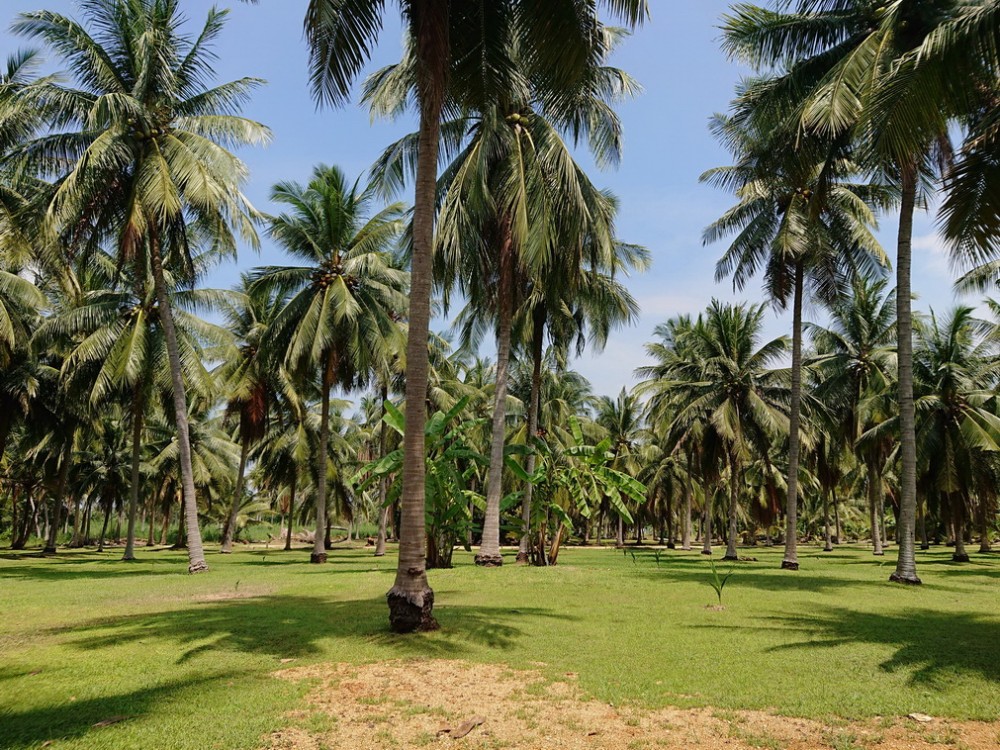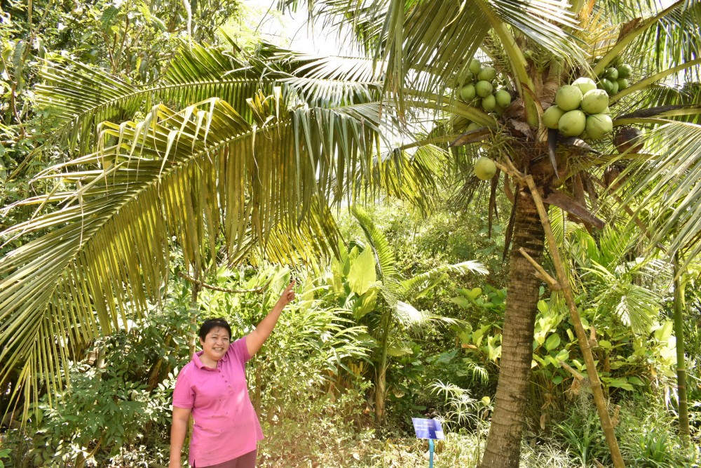อภิญญา บอกว่า ปลูกมะพร้าวพันธุ์หมูสีซึ่งเป็นพันธุ์พื้นเมืองในพื้นที่ 2 ไร่ ซึ่งเดิมทีมะพร้าวหมูสีเป็นพันธุ์ดั้งเดิมของที่นี่เป็นพันธุ์กินผลอ่อน น้ำมีรสชาติหวานแต่ไม่หอม มีลักษณะที่รอบหัวจุกผลมะพร้าวจะเป็นสีขาวเมื่อดึงขั้วจุกออกจะมีสีชมพูยังไม่มีเนื้อมะพร้าว ข้างในเป็นกะลาอ่อนรสชาติอร่อนคือ กรอบ กรุบ มัน หวานอ่อน และหอม ส่วนมะพร้าวที่มีอ่อน อร่อย สังเกตุคือหากรอบขั้วจุกมะพร้าวเป็นสีเขียวจะมีเนื้อมะพร้าว ใช้สำหรับกินเนื้อมะพร้าวอ่อนจะไม่สามารถนำกะลามากินได้ เพราะจะมีรสฝาด