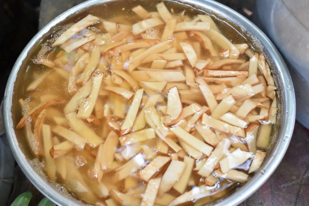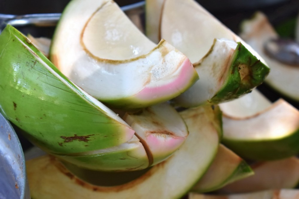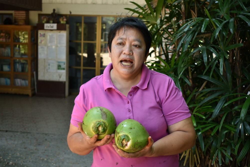 “มะพร้าว 50 ผล เมื่อฝานเนื้อกะลาอ่อนเสร็จแล้ว ก็จะได้ผลผลิตกะลามะพร้าวอ่อนพร้อมนำไปปรุงทำเป็นอาหารได้ประมาณ 2 กิโลกรัม นำมาขายในราคา กิโลกรัมละ 1,000 บาท โดยมีลูกค้าหลักที่สั่งจองคือร้านอาหารย่านถนนสาธร”